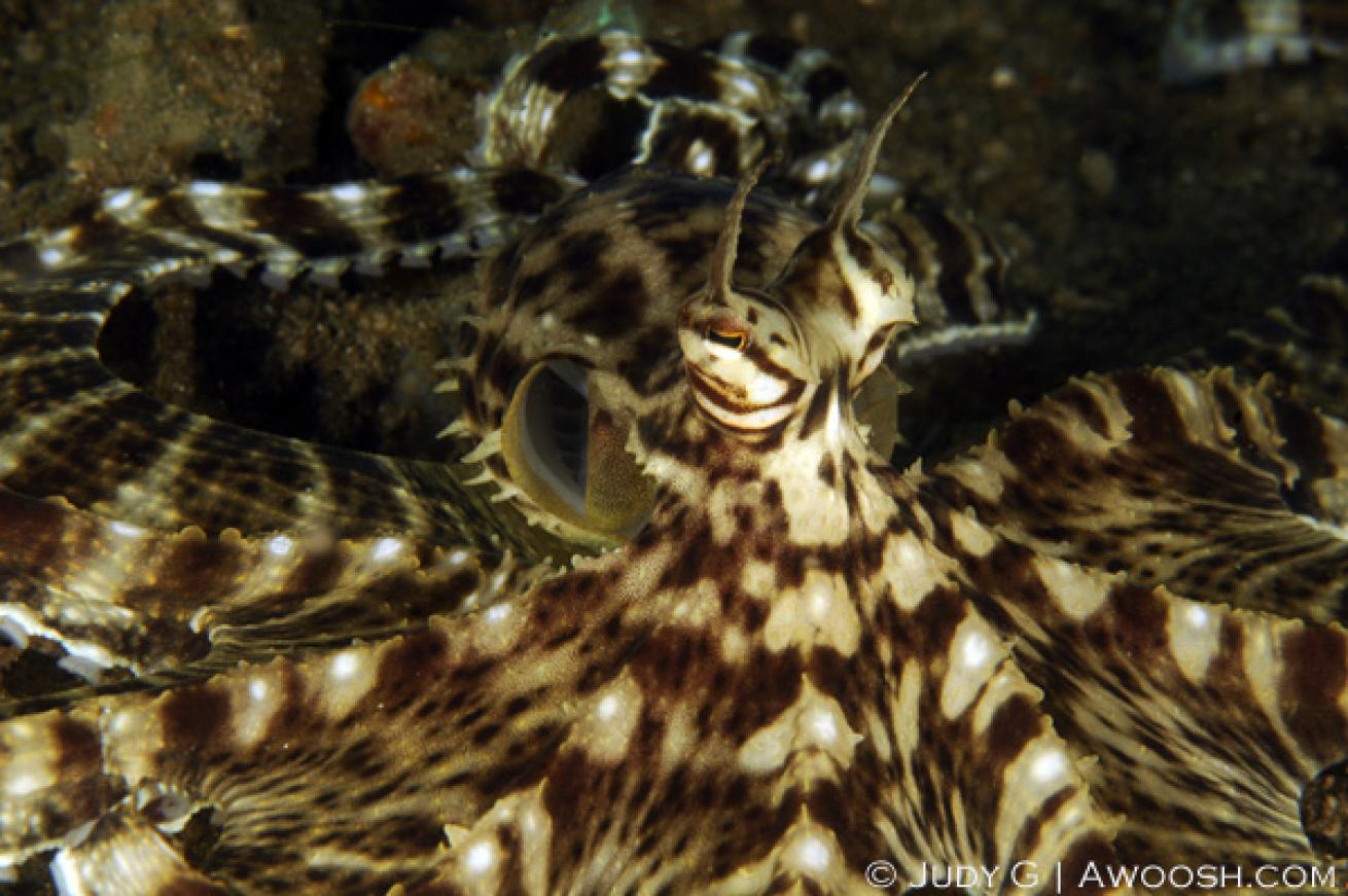 This fascinating octopus (among many fascinating varieties of octopus, squid and cuttlefish that can be found in Indonesia) is a shape shifter. It is a fairly reclusive animal that tends to burrow down in sandy bottoms with just its head poking up. When out on the reef it can change shape and color to look like other sea creatures — most often when I have seen them do this, they mimic (quite convincingly) a flounder.