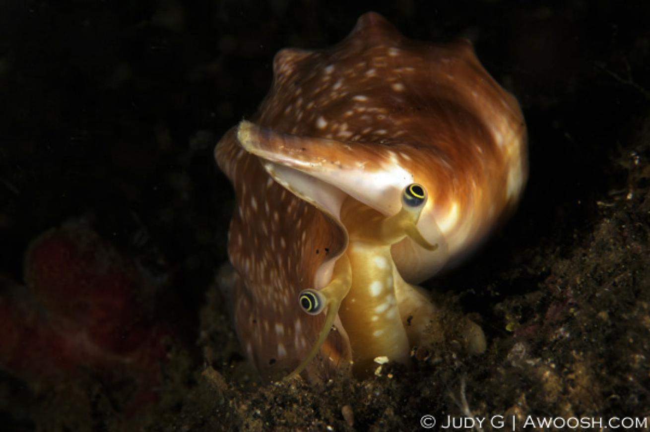 The eyes have it! This strange little conch was cruising around the reef on a night dive when spotted. It was about 3 inches in length.