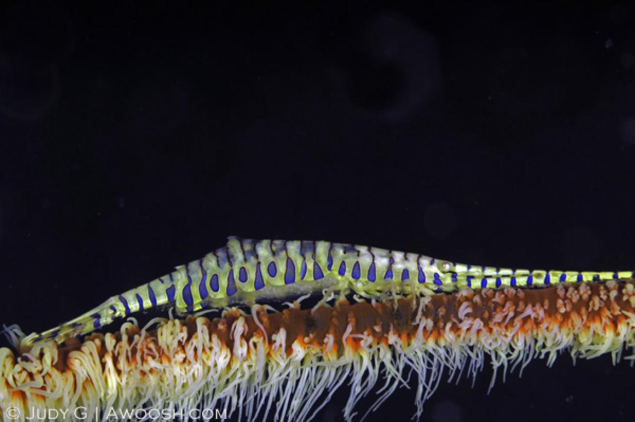 This strange shrimp is just one of approximately 80 varieties of shrimp documented in Humann and DeLoach’s most-excellent Tropical Pacific Reef Creature Identification book. Seriously, that is a huge variety of shrimp, and many of them are found in Indonesia. This strange shrimp has a needle-nosed rostrum, and its habitat is on coral whips and black corals. I’ve only seen one, and so I was thrilled to get this shot.