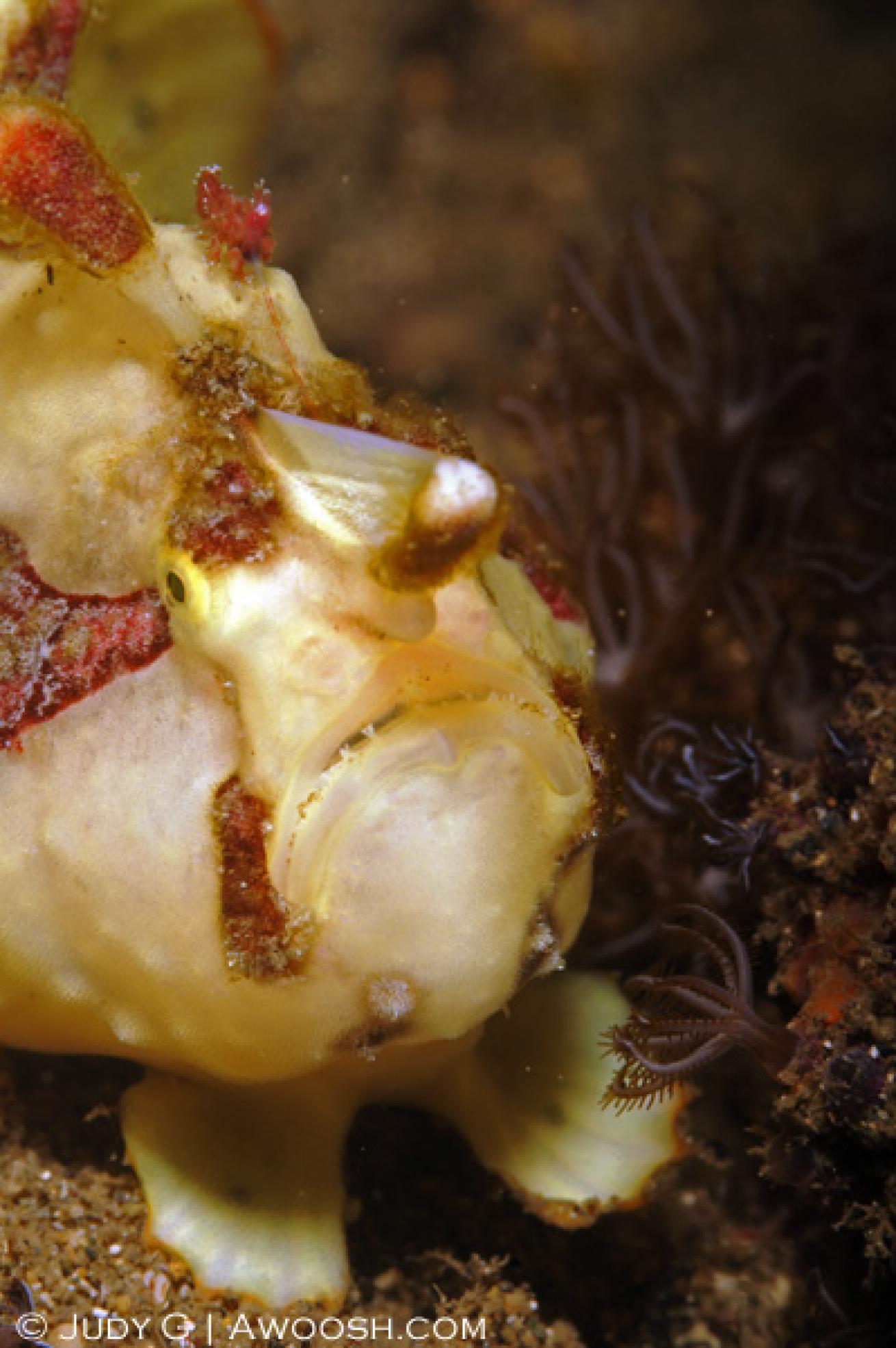 Many types of frogfish have little 'lures’ — small appendages that they deploy from their foreheads, with which they attract small fish. Then ‘wham’ — they strike and consume their prey with lightning speed. Frogfish also ‘yawn’ — it is a funny sight as they have huge, cavernous mouths, but I haven’t been lucky enough to capture one mid-yawn with my camera. I’ll admit that I am not a very patient photographer…