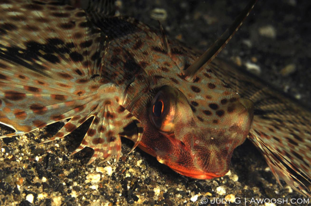 Is it a bird, or a fish? The Helmut Gunard has massive, wing-like pectoral fins, but it is known to creep along sandy bottoms on two leg-like front appendages, rather than swim. I’ve only ever seen this variety of fish on night dives, and they can be perplexing to photograph as they like to turn away from the camera, and are easily annoyed enough to swim away. I got lucky on this one.