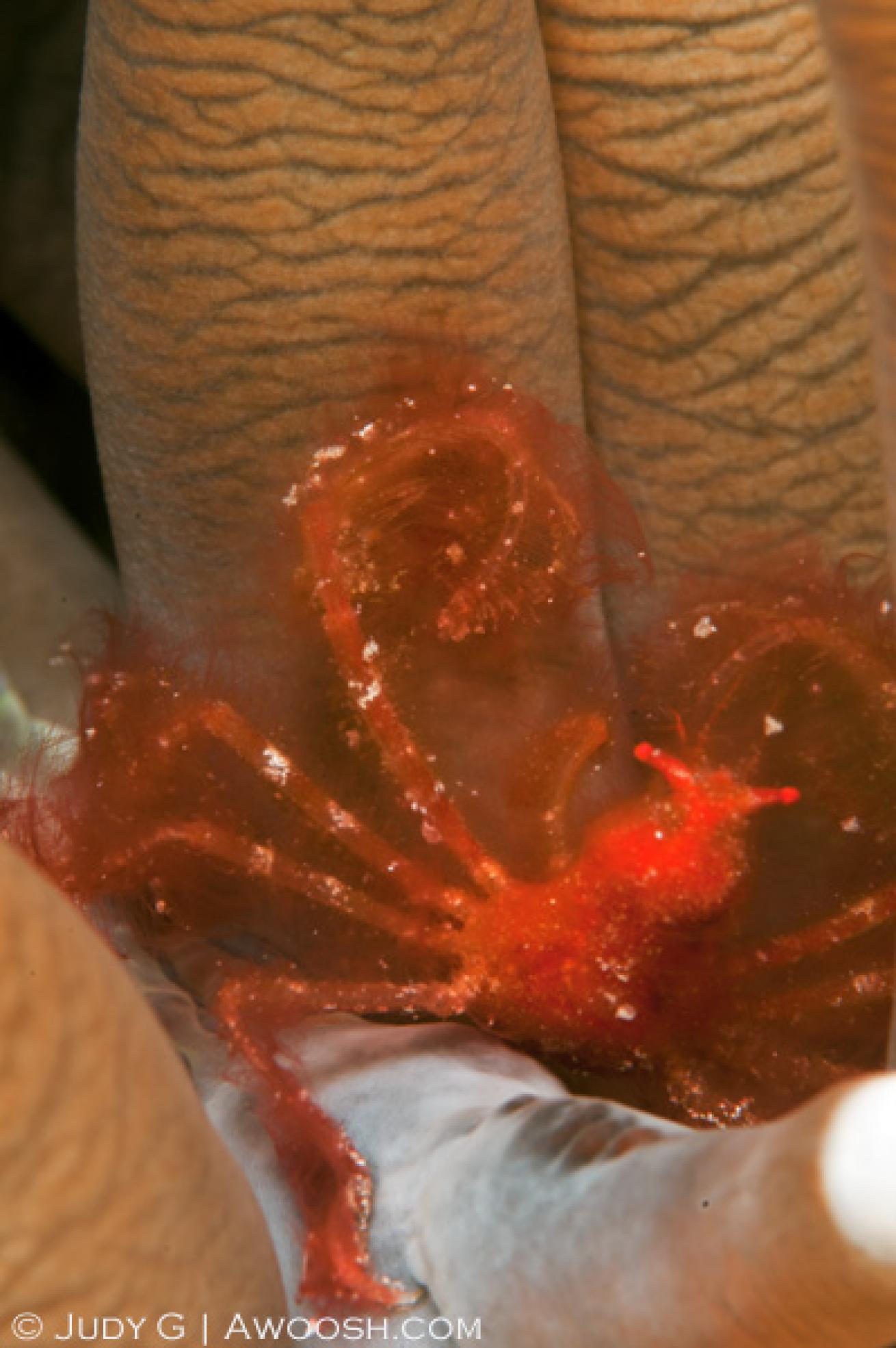 OK, crabs are generally pretty weird creatures, but check out this Chewbacca version. These little crabs are most often spotted on bubble corals, but I’ve also seen them on mushroom corals — which was where this one was photographed, off of southeastern Sulawesi in Indonesia. There are a staggering variety of crabs in the Indo Pacific — more than 100 distinct types are catalogued in the Humann and DeLoach book!
