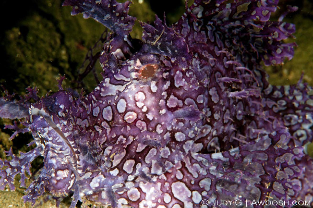 This fish had been on my wish list for many years before I finally got to see one. And to make it even more special, on the same dive (!) I also saw (and photographed) a pale pink Paddle-Flap Rhinopias. Both of these fish look to me like something Dr. Seuss would have created. This one appeared quite muted as it rested on a sandy bottom (fairly deep — about 75 feet) until it was lit by my strobes, and then it popped in purple! It was about 8 inches in length.