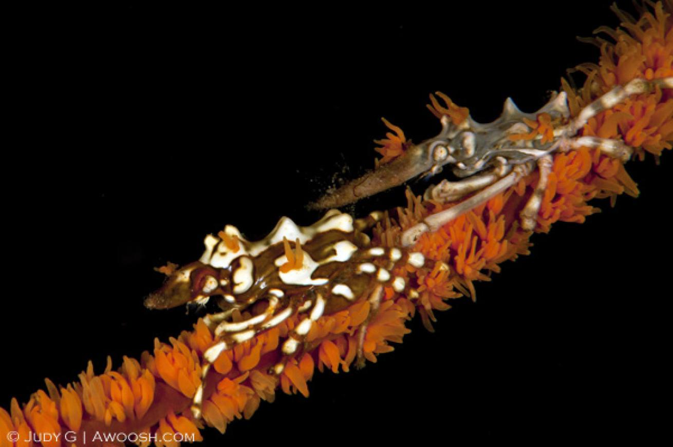 These are quite tiny crabs, which, as their name suggests, live on wire corals. In Indonesia it is worth having a close look on many of these whip-like corals that spring out of the reef, as often there will be a wire coral crab, shrimp or whip coral goby living on it. In current, it can be very challenging to photograph any of these little creatures (these crabs are about half-an-inch long), as the wire corals tend to move about quite freely in the breeze.