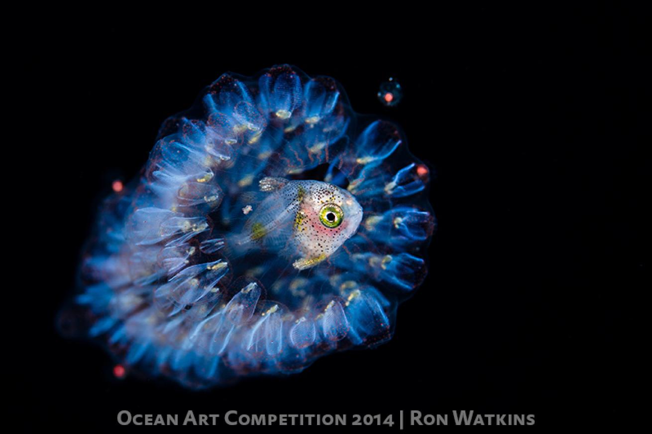 This photo of a juvenile carangid hiding in a pyrosome placed first in the Macro category of the 2014 Ocean Art Photo Competition. To read the story behind the shot — and see the full list of winners — go to Underwater Photography Guide's website.