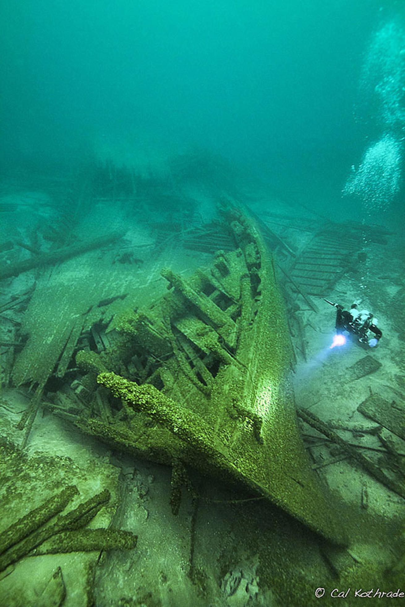 This popular shipwreck near Milwaukee WI, was a 135' wooden steamer that succumbed to a collision with ice in 1881. All souls survived the ordeal, and now the 165 foot deep hulk lies in two intact sections, with a collapsed middle. f/3.5, 1/15th sec, ISO1600, natural light. Canon T1-I, Ikelite housing, 10-22mm@10mm