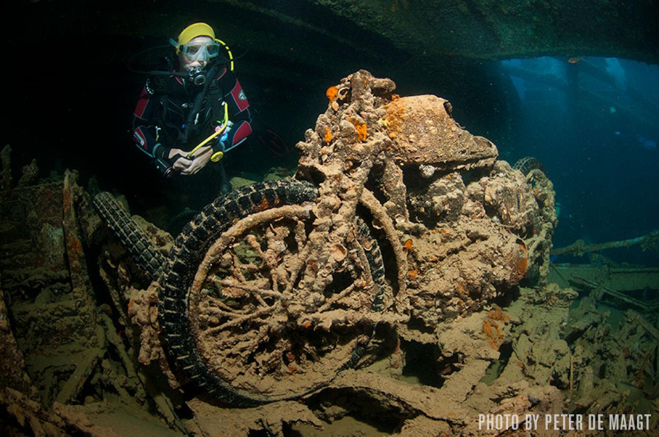 A dive trip to the Red Sea would not be complete without a dive on the famous Thistlegorm wreck. The wreck is full of artefacts from the second world war. Diving inside the Thistlegorm you'll find BSA motorbikes, Morris automobiles, Bedford trucks, trailers and armoured cars. My dive buddy was admiring an BSA motorbike which is still in a pretty good shape.