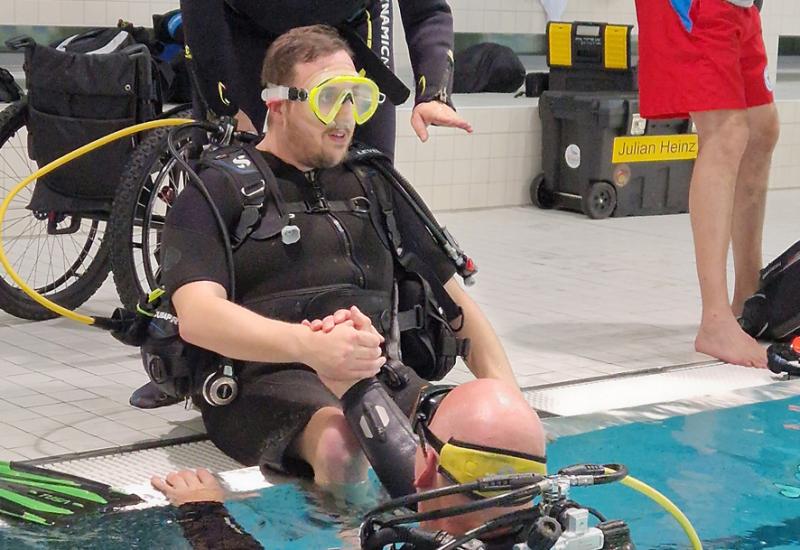 James BarrettJournalist James Barrett kits up for for his open water training in Bonaire at Buddy Dive.