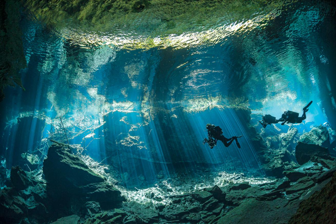 Jennifer PennerDivers fin through rays of light in Chac Mool, a cenote located in Puerto Aventuras, Mexico.