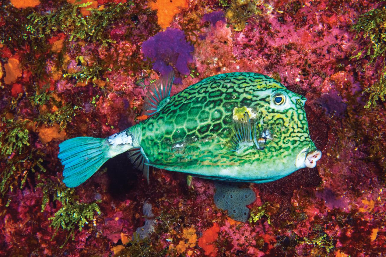 Brandon ColeA honeycomb cowfish pops out against a vibrant Cayman Islands reef.