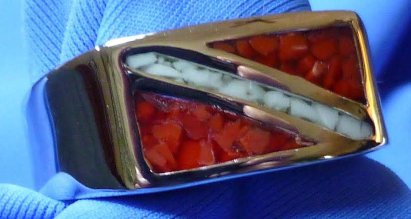 Wear your dive flag proud! From rings to key chains, each item features the classic red and white dive flag made of simulated red coral and mother-of-pearl chips inlaid into rhodium-plated bronze. Rhodium is a rare, silver to white metal in the platinum family. It is about 10 times more costly than gold, but will not tarnish and makes jewelry more durable. Use of simulated inlay in Dive Flag Jewelry protects coral reefs!