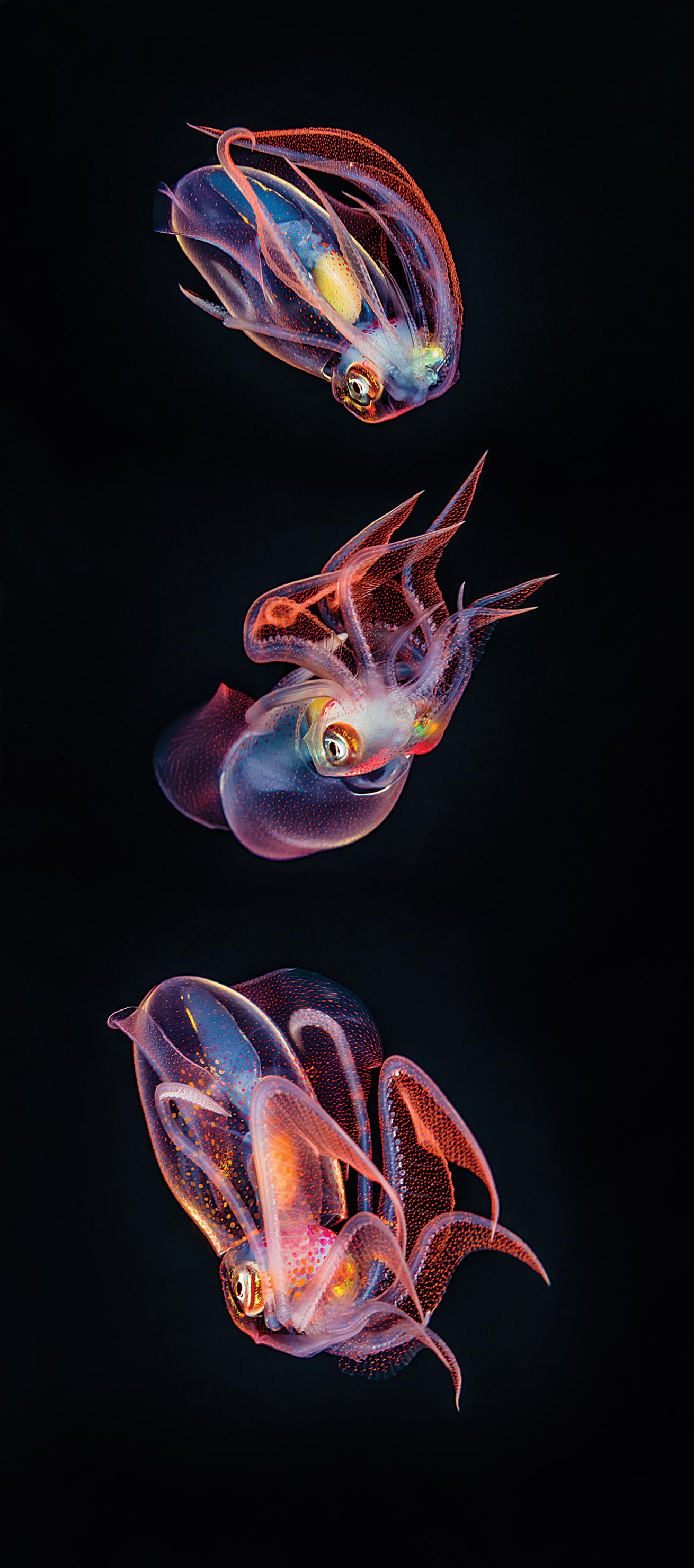 Each minute is something new: an animal that looks like a glowing dandelion, a dreamcatcher, a tiny flatfish D’Avella later identifies as a pelagic nudibranch. I see fish so oddly shaped that no imagination could dream them up, translucent shrimp and a juvenile crab the size of a pencil eraser that attaches to my finger. So many microscopic animals, they look like tiny spaceships floating in a galaxy of stars.