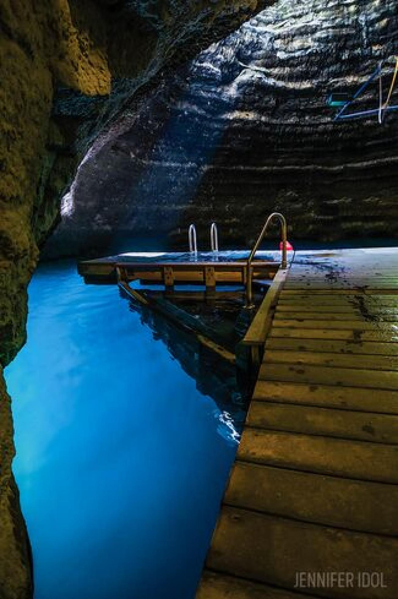 The water glows brilliantly, reflecting blue throughout the crater. Much like the Valhalla missile silo in Abilene, Texas, this feels like descending down a giant tube of water.