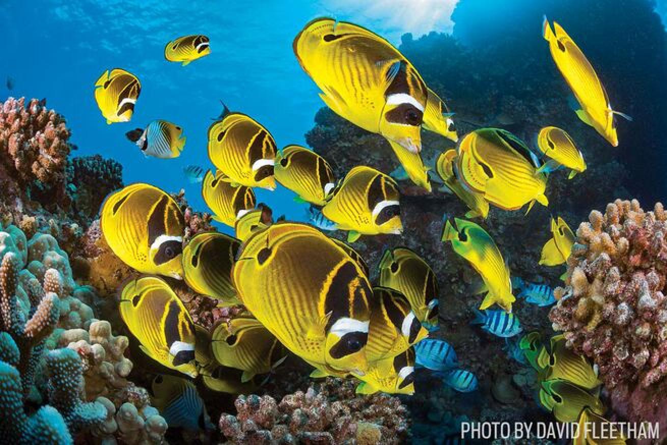 Schooling raccoon butterflyfish off the island of Lanai, Hawaii