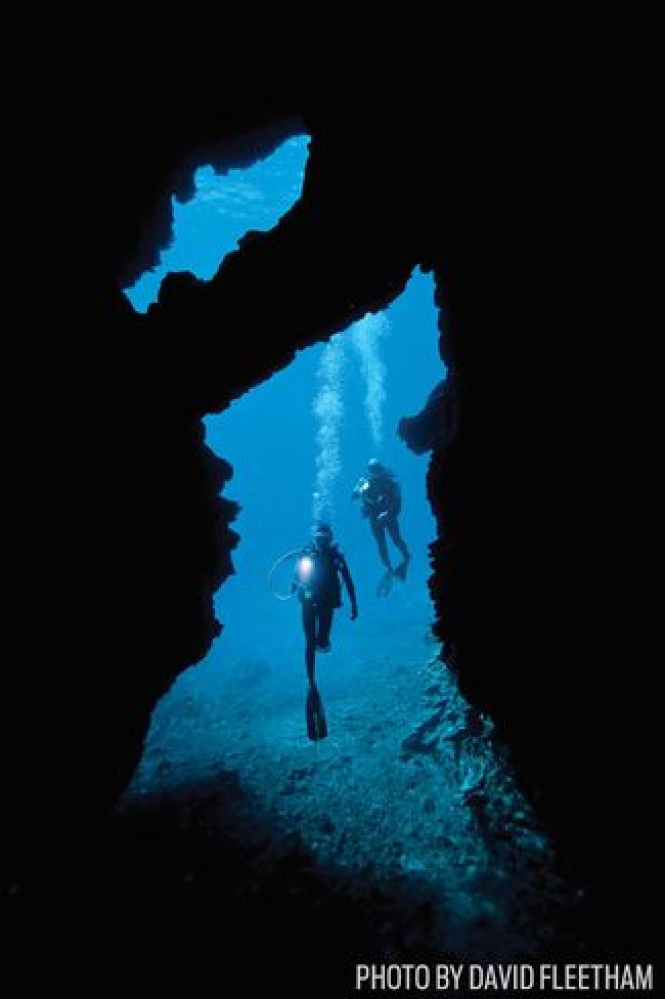 For the same reason Juarez dives Second Cathedral later in the morning, we’re diving First Cathedral as our second dive. And like its sister site, First Cathedral is aptly named. “Some of us even got married in there,” Juarez says. “Part of the roof collapsed, and the big lava rock that fell to the floor of the cavern is what we call the Altar.” On Jan. 5, 2015, Steve exchanged wedding vows with his wife, Robin, here.