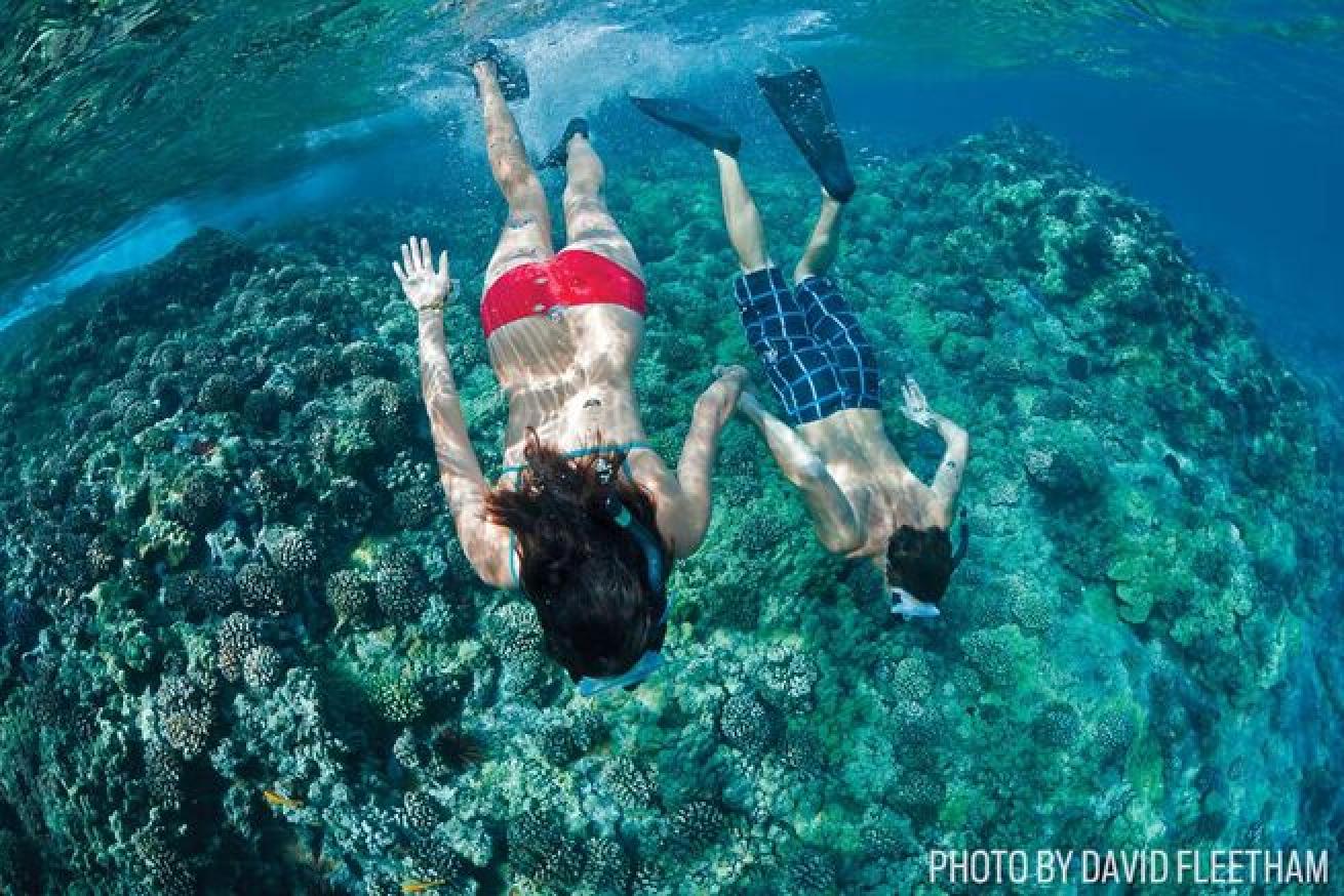 A couple free diving at Molokini Marine Preserve off the island of Maui, Hawaii