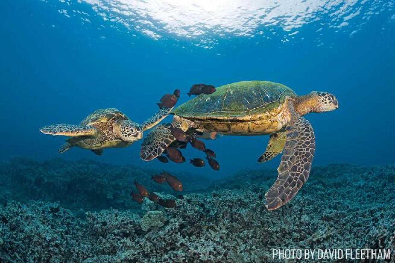Green sea turtles have their shells cleaned by a school of goldring surgeonfish off Maui, Hawaii