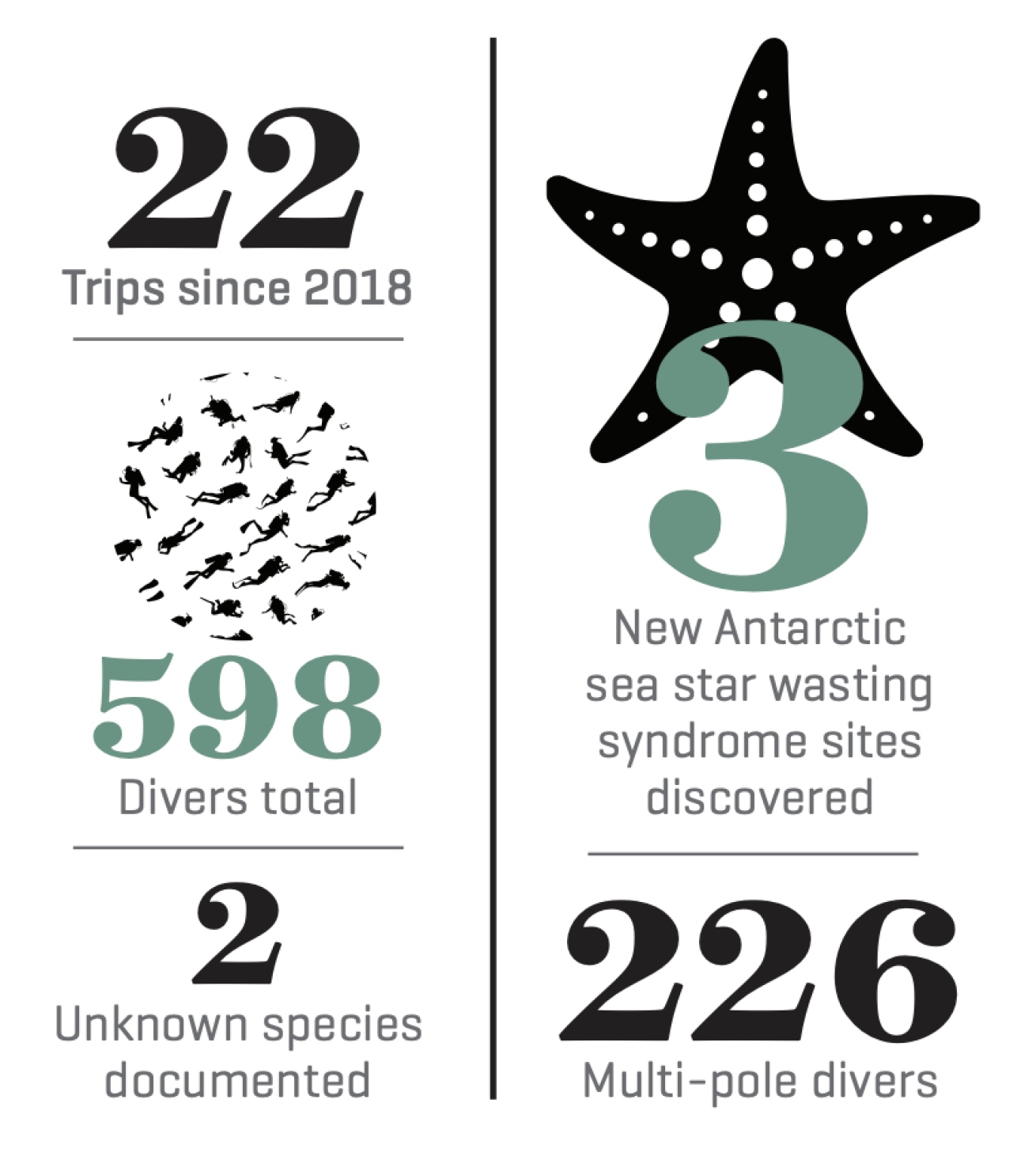 Blue Green Expeditions was among the first to document sea star wasting syndrome in Antarctica, a disease thought to be confined to northern waters. This research helps marine scientists like Dr. Amy Moran study the cause of the devastating disease, which has affected 20 species of sea stars since its onset more than 10 years ago.