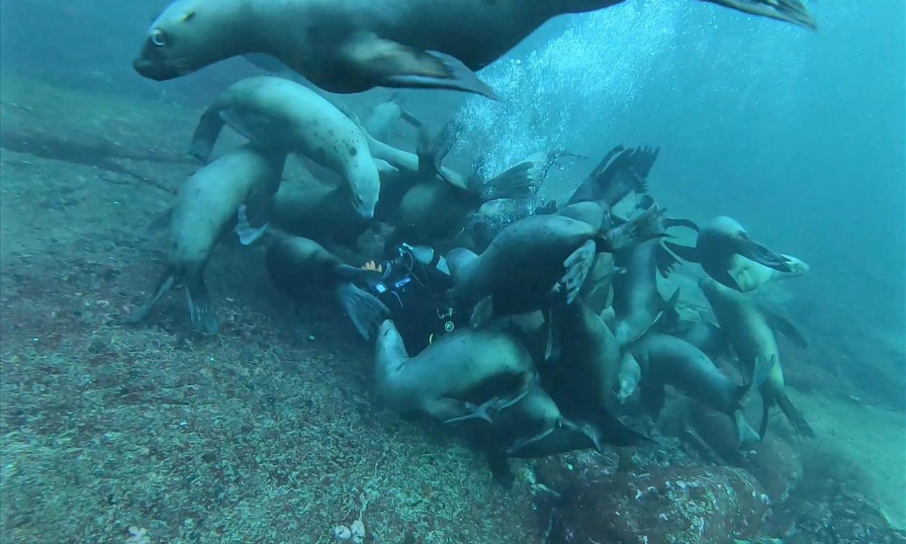 Courtesy Faith OrtinsA group of curious sea lions comes in for a close inspection of a diver.
