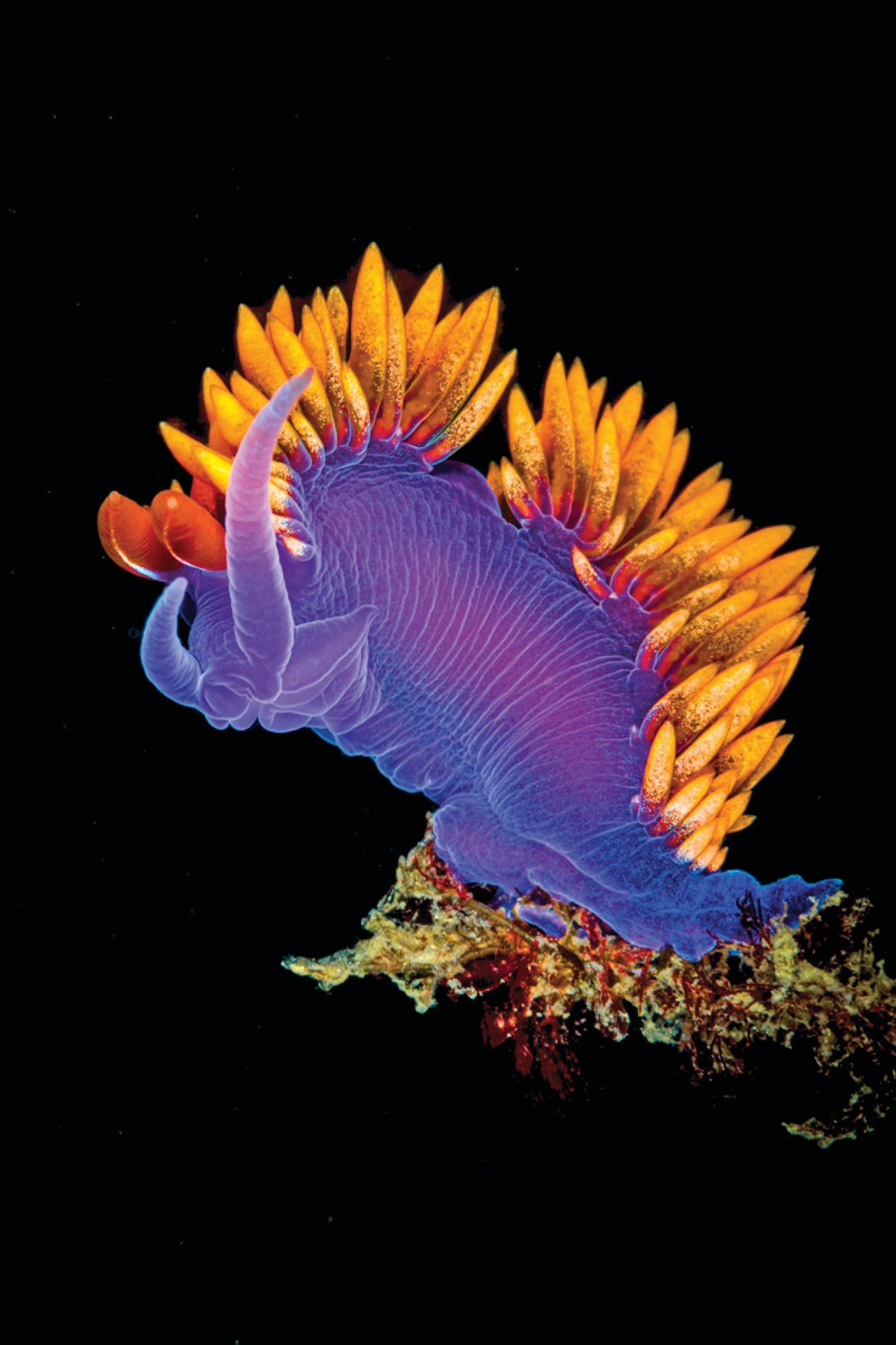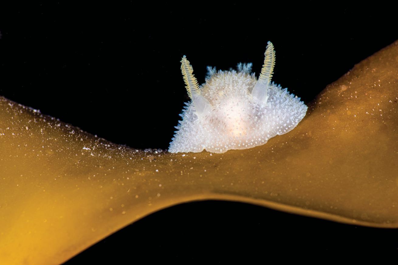 1. Nudibranchs come in many colors and shapes, but I usually choose which to shoot based on where I find them. I like the shape of the kelp in this image, and the fact I could isolate the nudi against open water for the black background. Nudis often look eye-catching when photographed from directly ahead with their rhinophores (the chemosensory protrusions on their heads) in crisp focus. This species is often found on kelp on both the West and East coasts of North America, as well as the European coast in the Atlantic. I photographed this one in Norway.