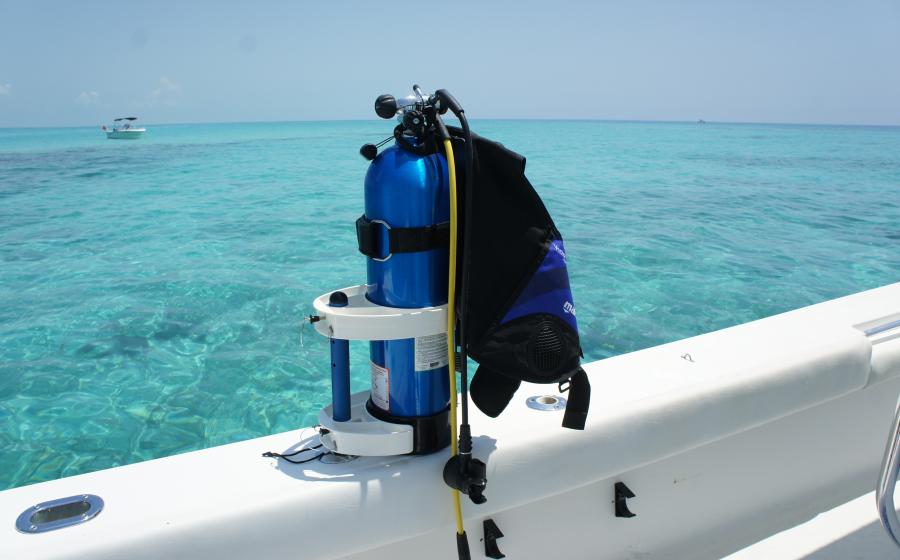 The "SDAS One" will assist the diver in preparation for their dive like no other dive accessory can. Simply assemble and install the "SDAS One" into a typical rod holder located at one of the boats side gunwales, clip your air tank into the compression clip to immobilize it, and fit your BCD and regulator to the air tank.