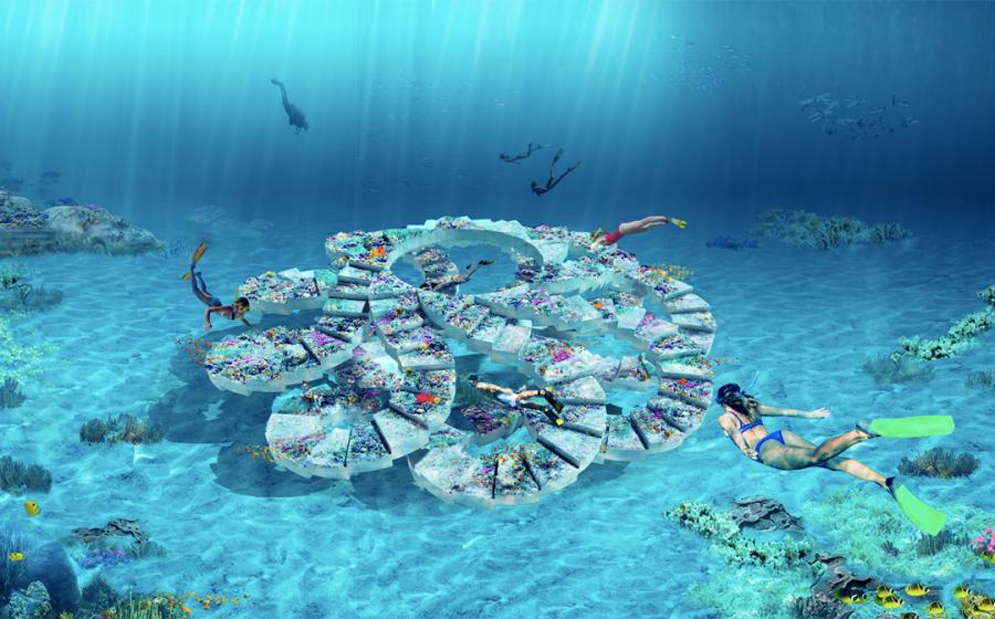 The biomimetic design houses an underwater glass wall so visitors and scientists can see marine creatures in their natural habitat.