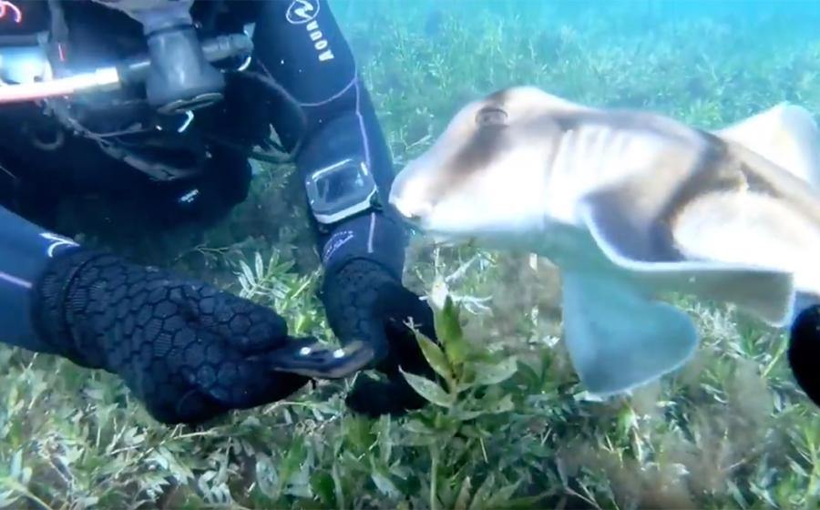 Two divers freed a shark snared by a fishing hook to the seafloor off the coast of Australia.