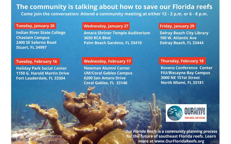 The *Our Florida Reefs* community representatives invite all southeast Florida community members and visitors alike to participate in the *Our Florida Reefs* community meetings, coming up later this month and in February.