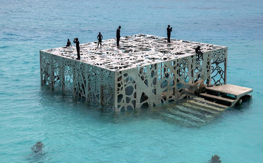 Jason deCaires Taylor unveils a new underwater art exhibit in the Maldives, called the Sculpture Coralarium at Fairmont Maldives.