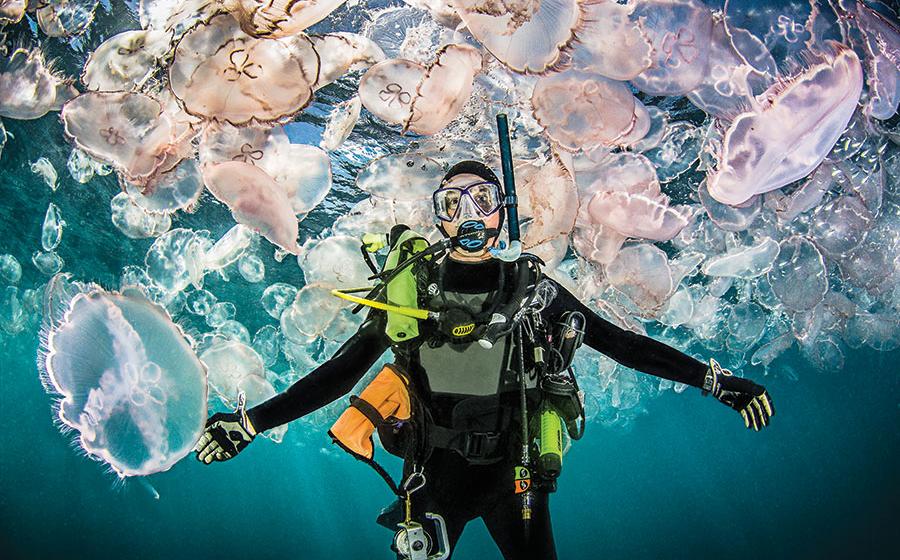 Moon jellyfish drift en masse between surface and reef. Read about one diver’s secret spot in Jupiter, Florida, where you’ll find moon jellyfish galore.