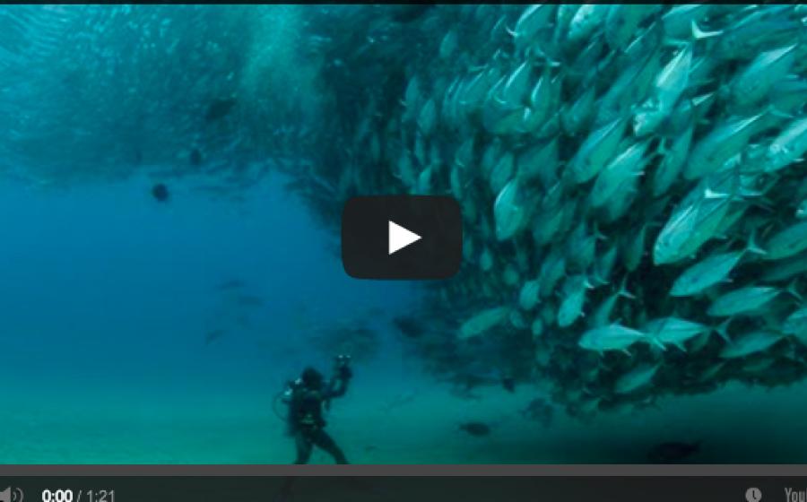 A swarm of jacks in Cabo Pulmo Park, Mexico, dwarfs an underwater photographer in a phenomenal courtship display.