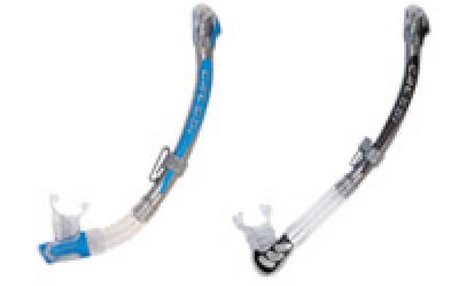 The Supernova Dry snorkel from Cressi uses a 100 percent silicone mouthpiece and a corrugated breathing tube, and comes with a large, easy-to-clear purge valve on the bottom, and a completely dry top on the other end. It’s the perfect design in a snorkel, allowing for effortless breathing performance when cruising along on the surface, plus it eliminates virtually all water from entering the tube when submerged.
