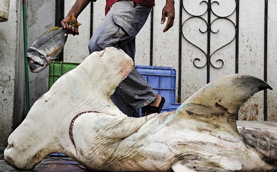 Photographer Thomas Peschak comes across a hammerhead that's lost its life to the shark fin-trade on the streets of Oman.
