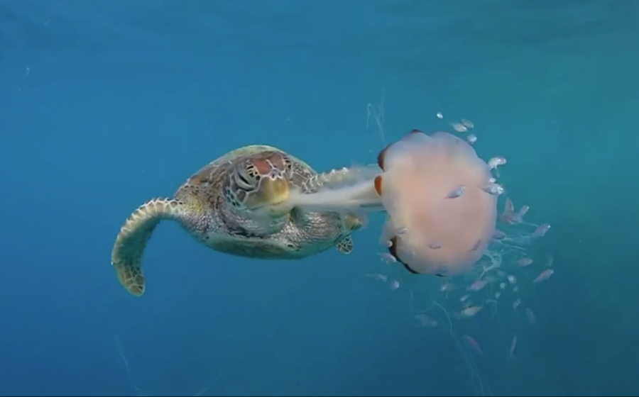 Watch as this hungry sea turtle snacks on a jellyfish, slurping its tentacles like spaghetti.