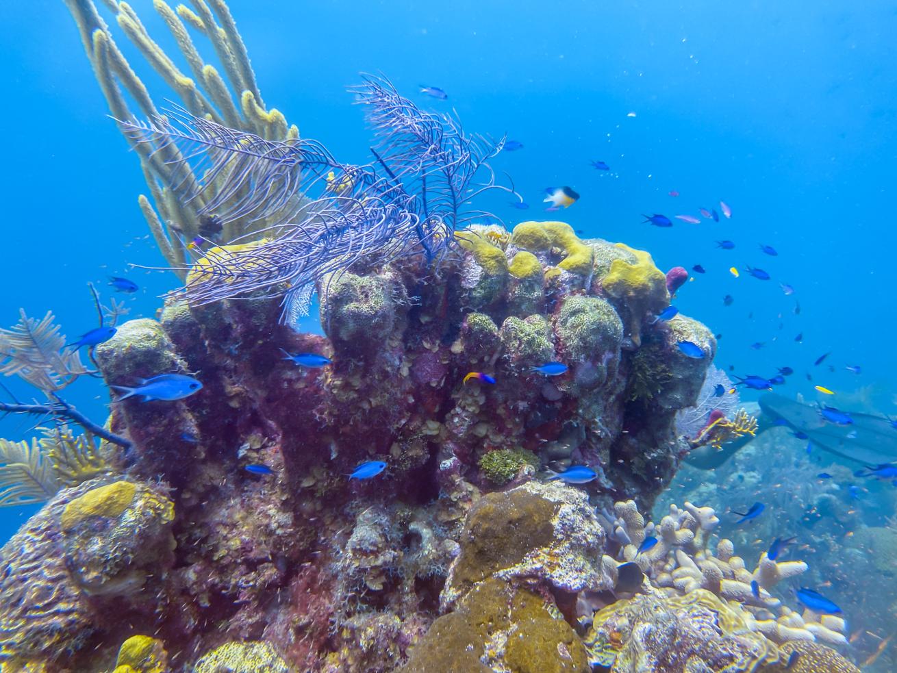 Jamil DonithColorful tropical fish swim around corals in the vibrant blue waters of Belize