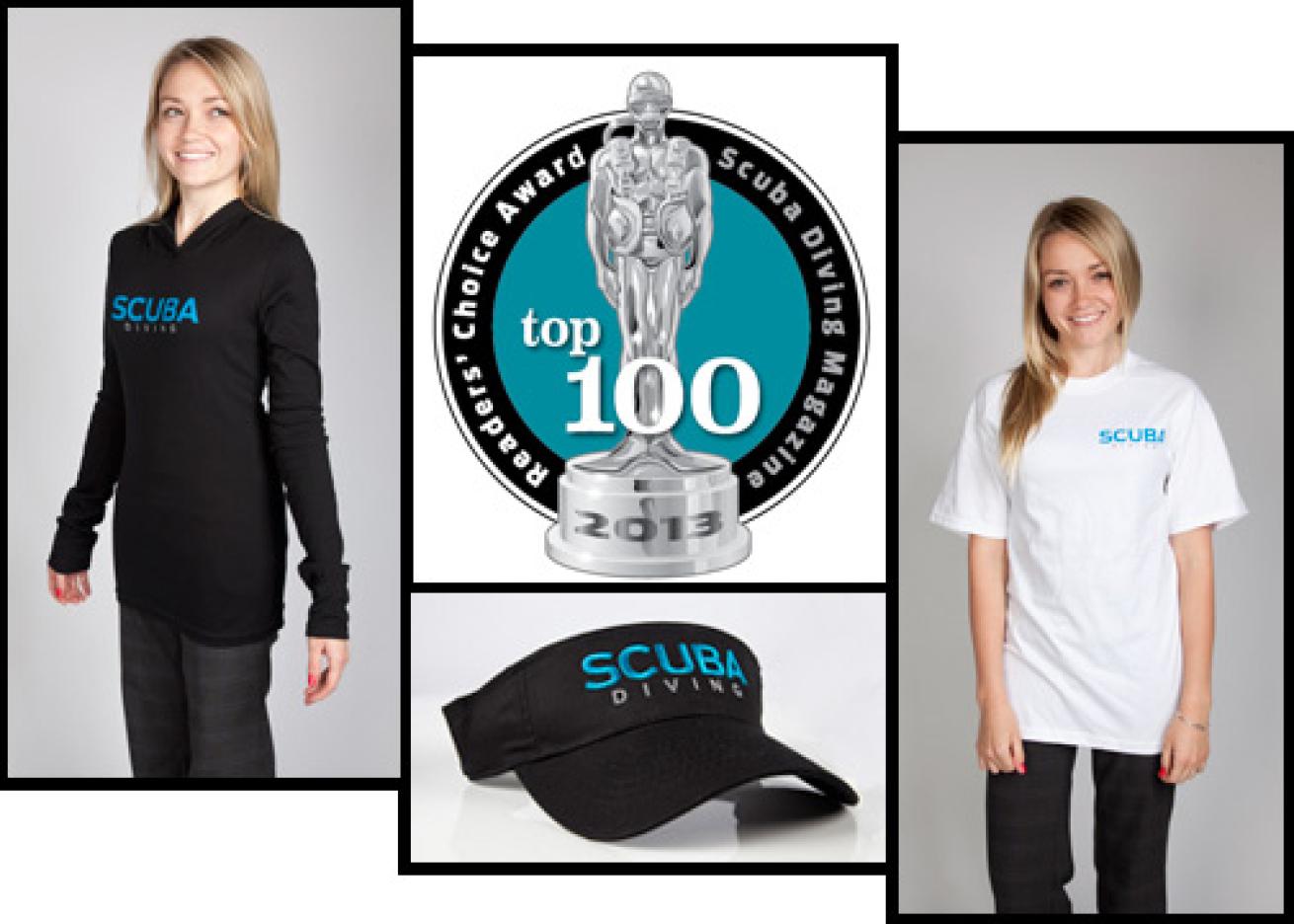 Yep, it's true: Everyone who submits entries to Top 100 or the Gold List will be entered in a monthly drawing for August and September for a Scuba Diving visor or T-shirt. All you have to do is enter — and you can enter multiple times. Now on with the show...