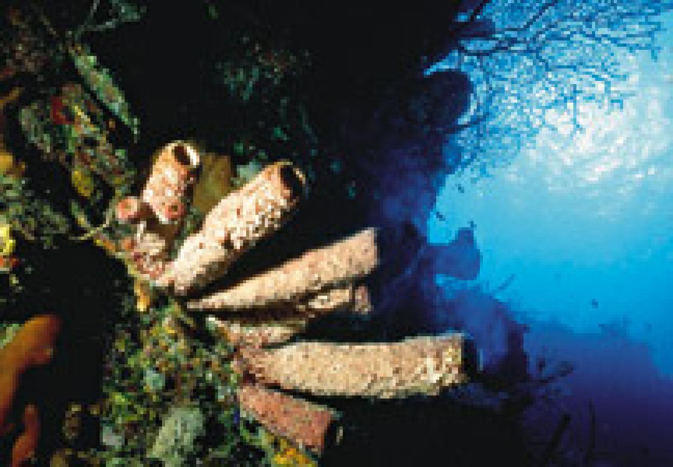 The wall drops well over 1,000 feet, but for the beginning tech diver, I recommend a dive to 150 feet for 20 minutes, leaving you with only nine minutes of deco on air. If you're advanced nitrox certified, you can gain a physiological advantage by breathing 38 percent nitrox (available from shops on Grand Cayman and Cayman Brac) on the deco stops. Another option: Make the entire dive on 27 percent nitrox and cut your deco time to six minutes.