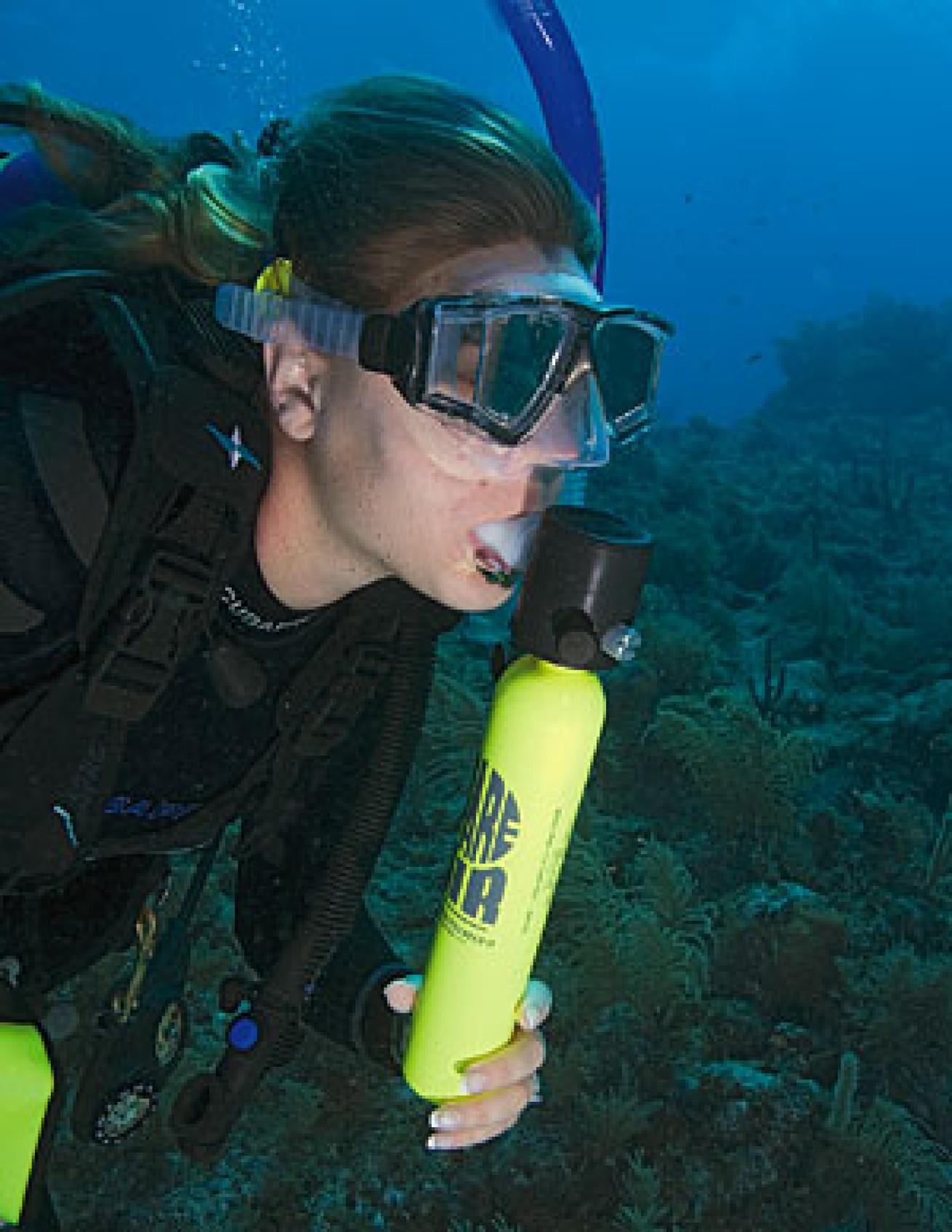 A: In an out-of-air situation, getting to the surface should be your priority, and compact redundant air sources like yours are specifically designed for a controlled ascent all the way to the surface at the standard rate of 30 feet per minute. Remember, for recreational dives, safety stops, while highly recommended on deeper dives, are not required. Also, do not count on having 50 breaths. Remember that 50 breaths on the surface will only equal 25 breaths at 33 feet (two atmospheres) and only 12 breaths at 99 feet (four atmospheres). And that is the best-case scenario; your test probably didn't simulate the anxiety of truly being out of air underwater. On its web site, the manufacturer of the most common compact emergency air source, Spare Air, recommends making "a practice ascent" from recreational depths so you know how many breaths it will give you.