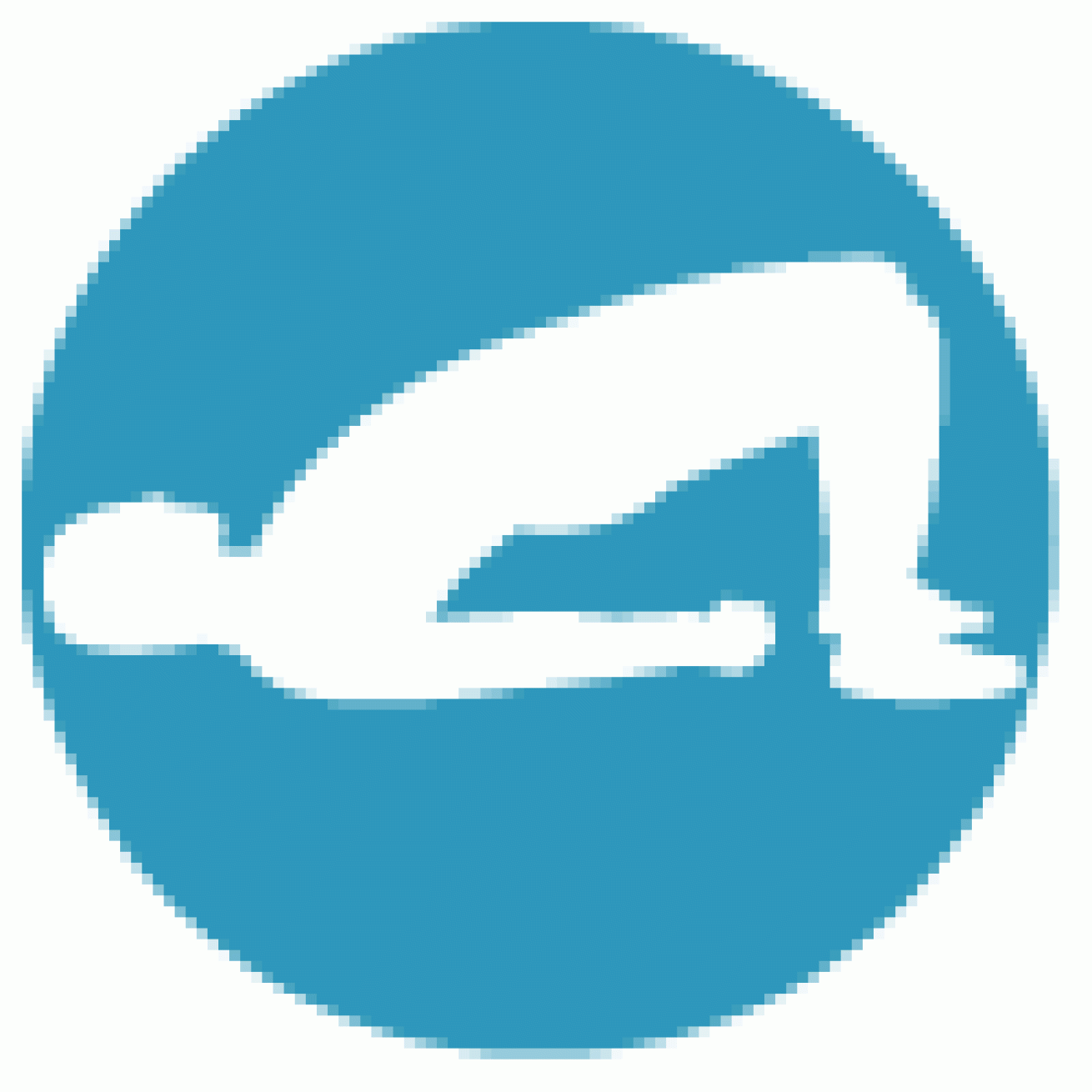 Lie back on the floor with knees bent and feet flat on the floor. Bring your heels as close to your butt as comfortably possible. Extend your arms down at your sides, palms flat on the floor. Keeping your thighs and feet parallel to each other, press into your feet, contract your glutes and press your hips up toward the ceiling as far as comfortably possible, so you are supporting your torso with your shoulders. Clasp hands on the floor behind your back. Open the shoulders and press breastbone toward chin.
