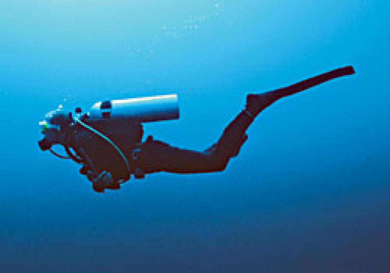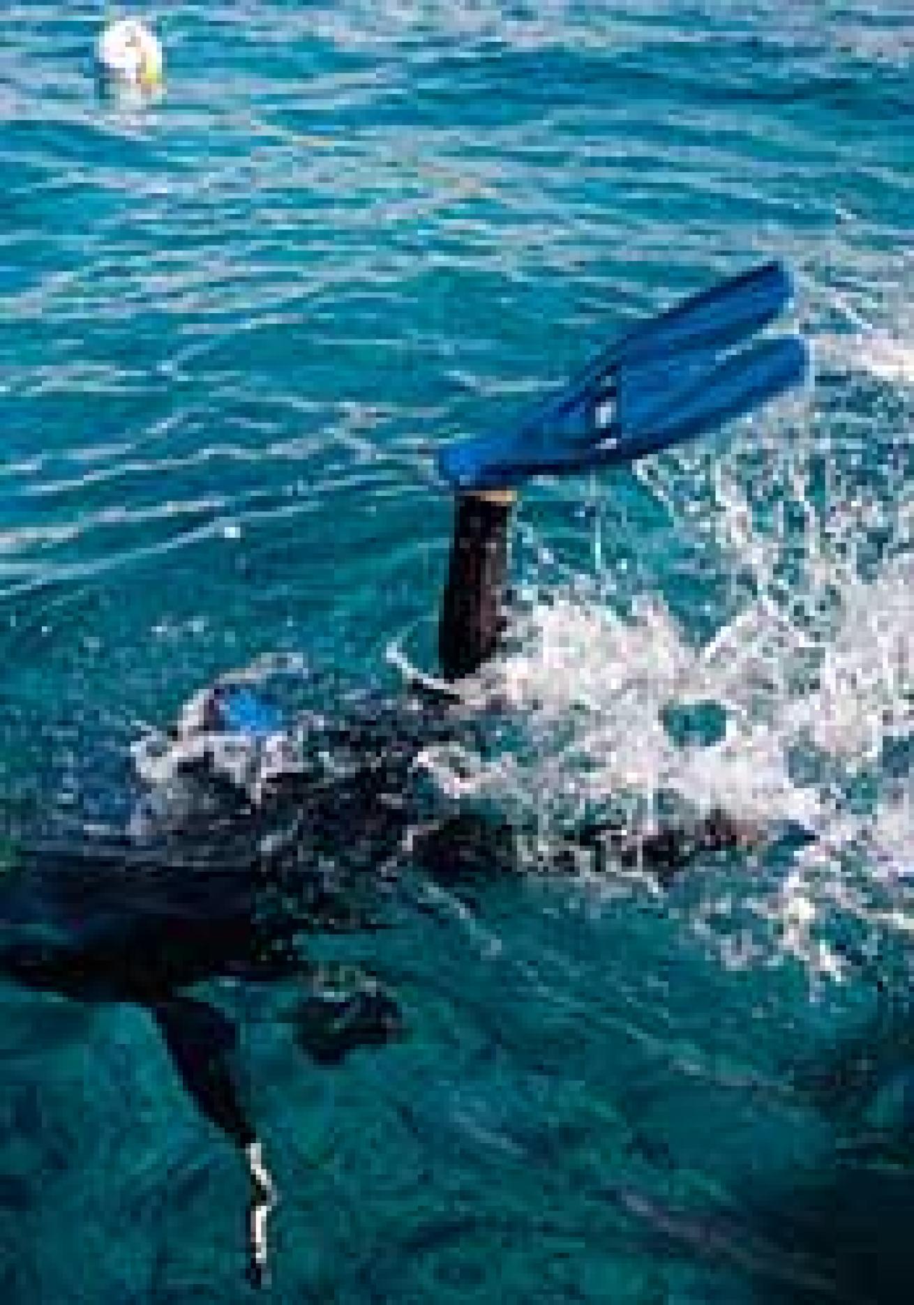 With minimum weighting, the first five feet of descent can be difficult, until pressure forces the residual air out of your wetsuit and starts compressing bubbles. Some divers force the five-foot barrier by making a head-first surface dive on fin power. Here's the technique: