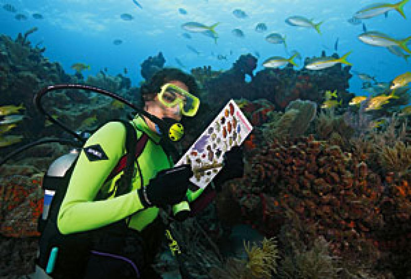 REEF teaches fishwatching with a purpose, and you can help make a difference by taking part in REEF's fish survey programs. There is a hierarchy of participation based on your fish ID education and surveying experience. Go to the store at reef.org or check your local dive shop for REEF's home-study course, which comes with everything you need to get started on your novice fish knowledge. Divers who really get into it can work toward the expert experience levels for opportunities to join in-depth monitoring projects and help train new fishwatchers.