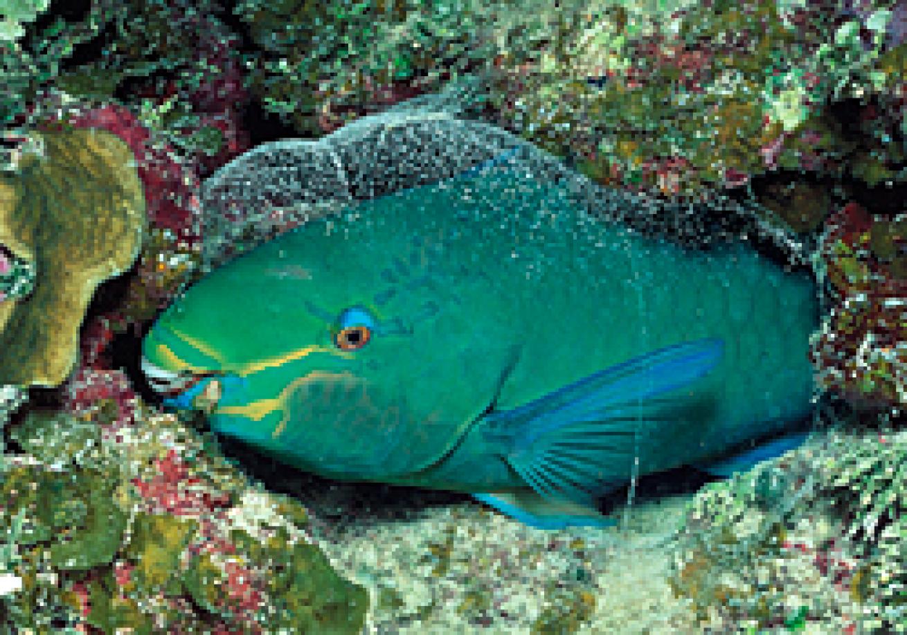 At Dusk: Hunters from both daytime and nighttime shifts look for quick kills in the confusion. Reef sharks, for example, hug the reef so their prey is silhouetted against the twilit surface. As daytime fish settle in for the night, defenses go up. Triggerfish dive into crevices and erect dorsal spines to lock themselves in place. Parrotfish wrap themselves in a blanket of repellent mucus. Mating also takes place in the fading light. Surgeonfish, grouper and wrasse engage in "spawning rises," ejecting bursts of eggs and sperm into the water.