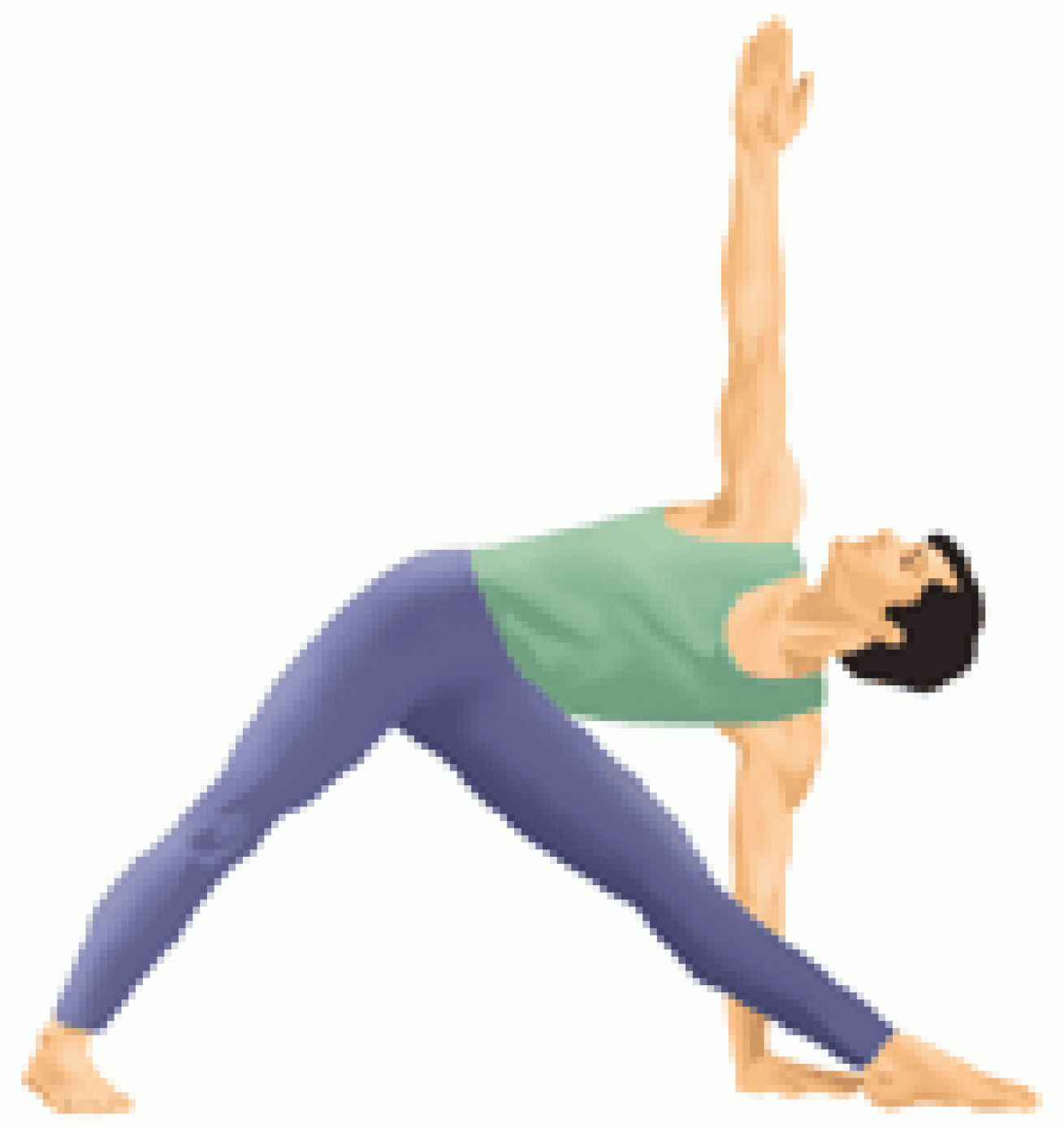 Bend to the side and reach your right hand down your right leg as far as comfortably possible, while extending your left hand up toward the ceiling. Look up toward the ceiling.