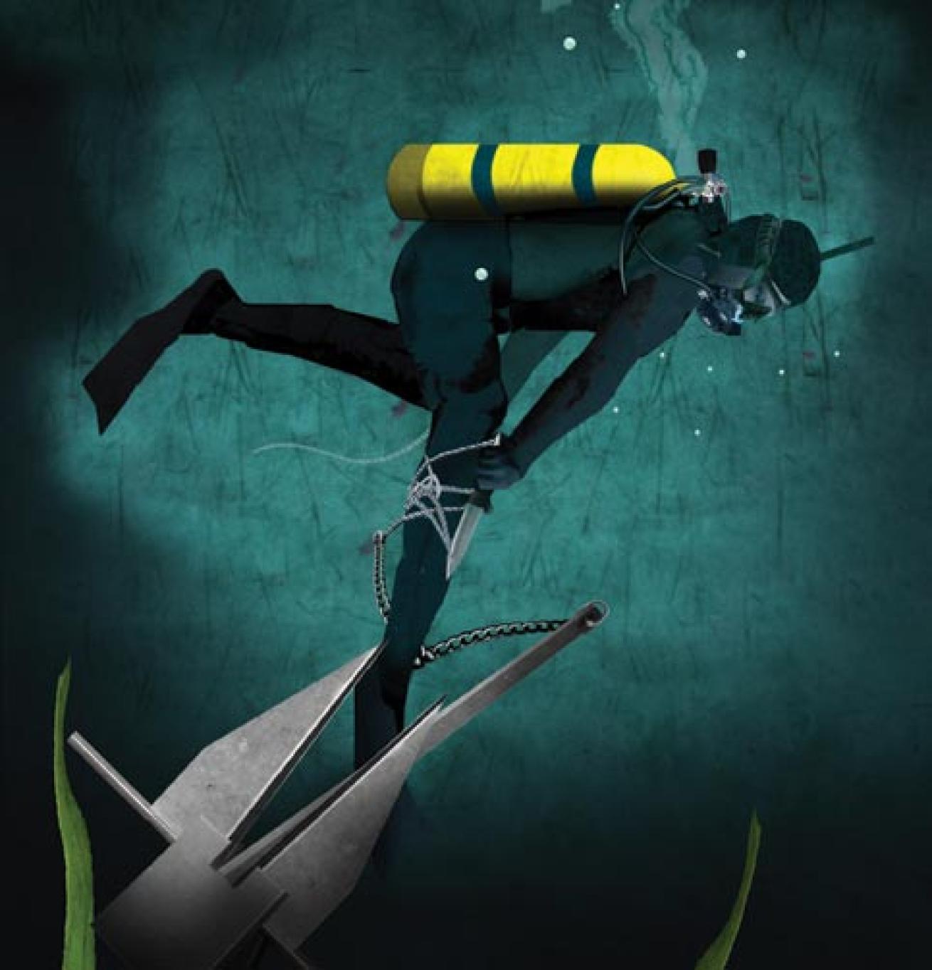 Normally, the pair would work together and carry the anchor to the surface, using the extra lift from their BCs. This anchor was larger than most they had recovered, weighing approximately 25 pounds and connected to at least 100 feet of half-inch nylon line with 5 feet of chain at the bottom. Matt wasn’t sure how Jake planned to bring it up on his own.