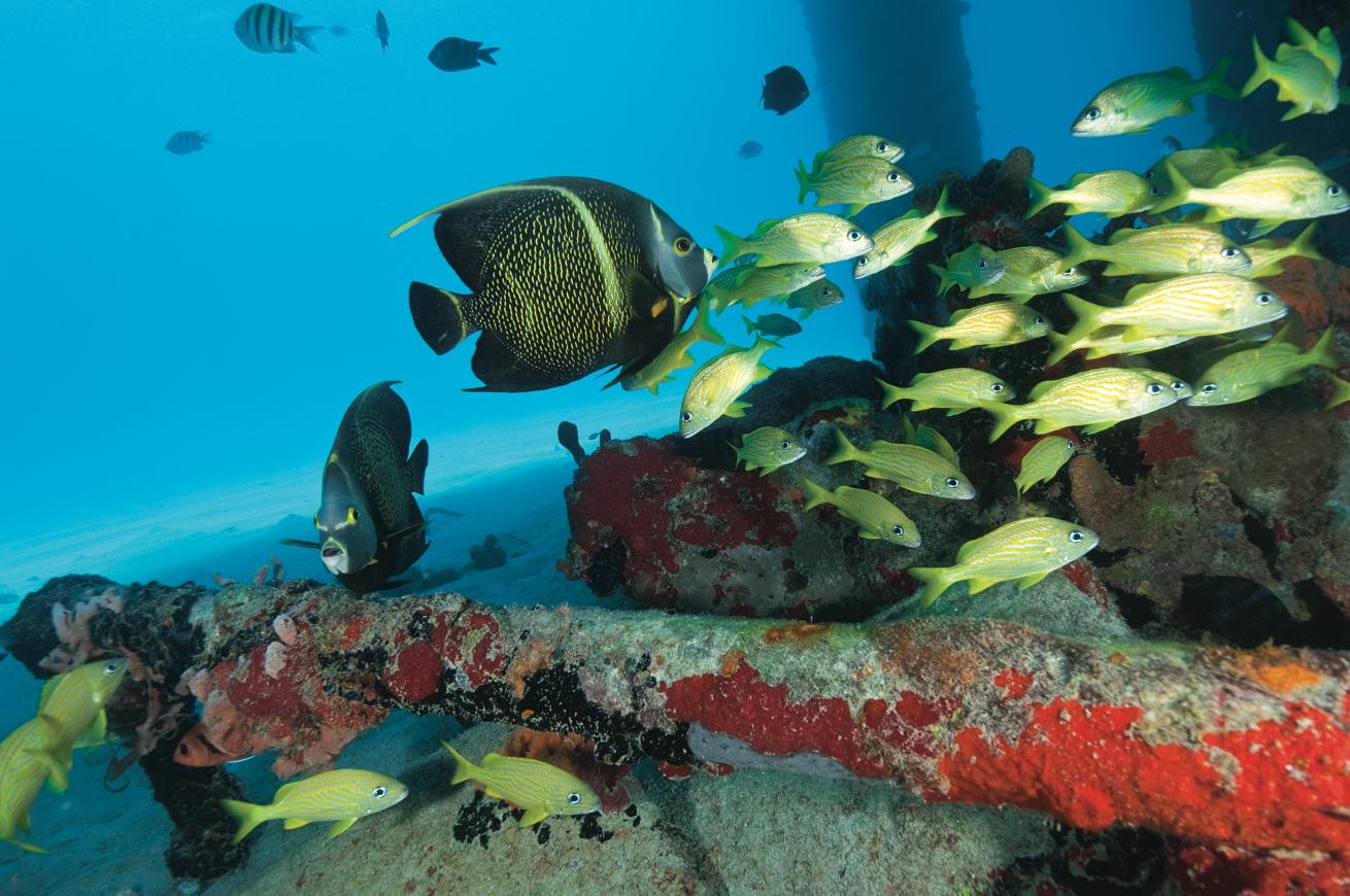 The pier’s legs are plastered with sponges — a profusion of finger, encrusting and tube sponges vie for real estate — and longsnout seahorses are tucked in between the mass of life. Batfish and seahorses aren’t the only creatures making a living under the pier. Comical-looking balloonfish hide in crevices. Jawfish poke their heads out from the safety of hiding places among the piles of small boulders and debris. Get even closer to spot yellowline arrow crabs gingerly high-stepping out of cracks, shy secretary blennies peeking from their tiny burrows and spotted cleaner and coral banded shrimp clinging to bottles that have become part of the underwater landscape. This is a place of refuge for peacock flounders, frogfish and juveniles of many reef species like blue and brown chromis, sergeant majors, gobies and barred hamlets.