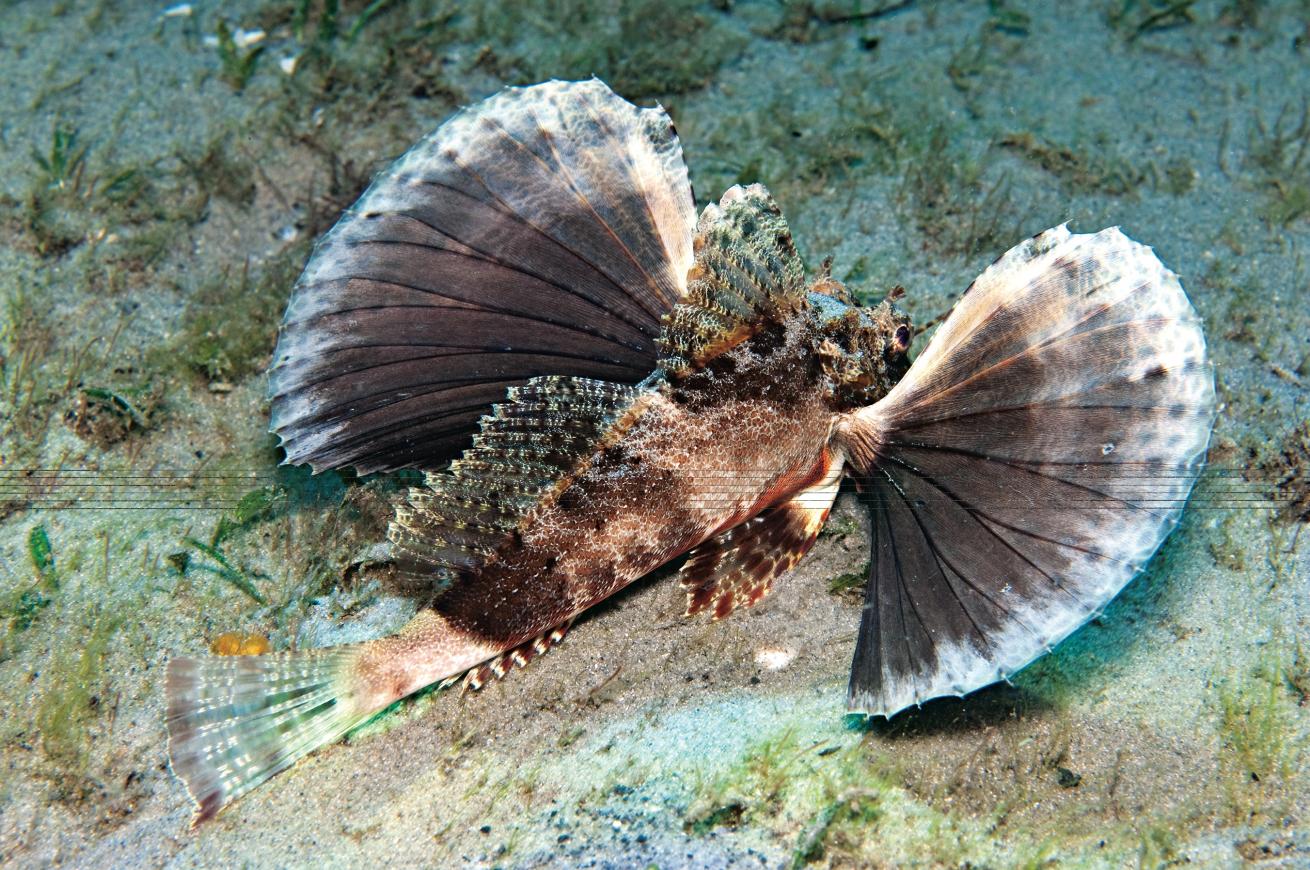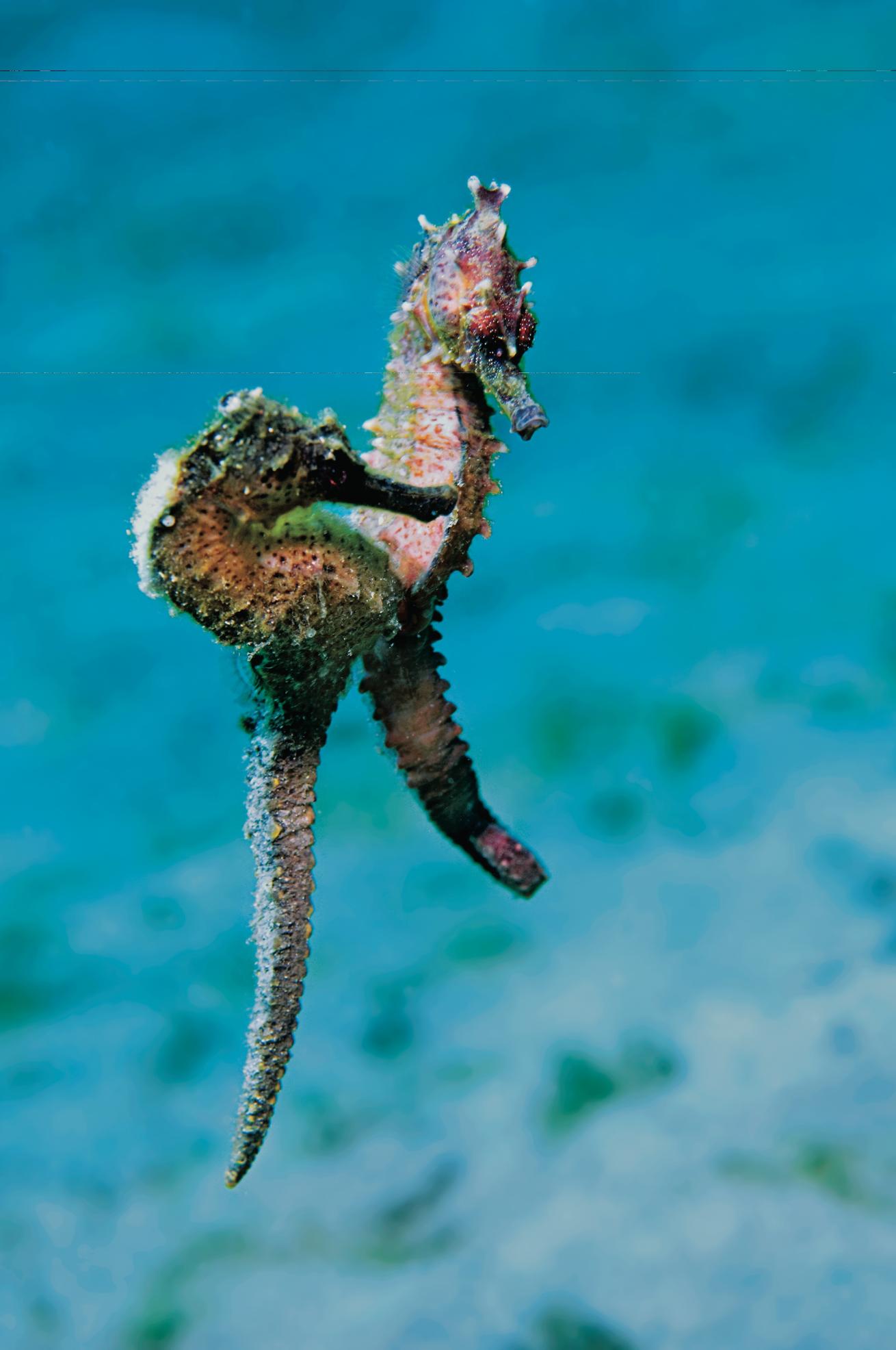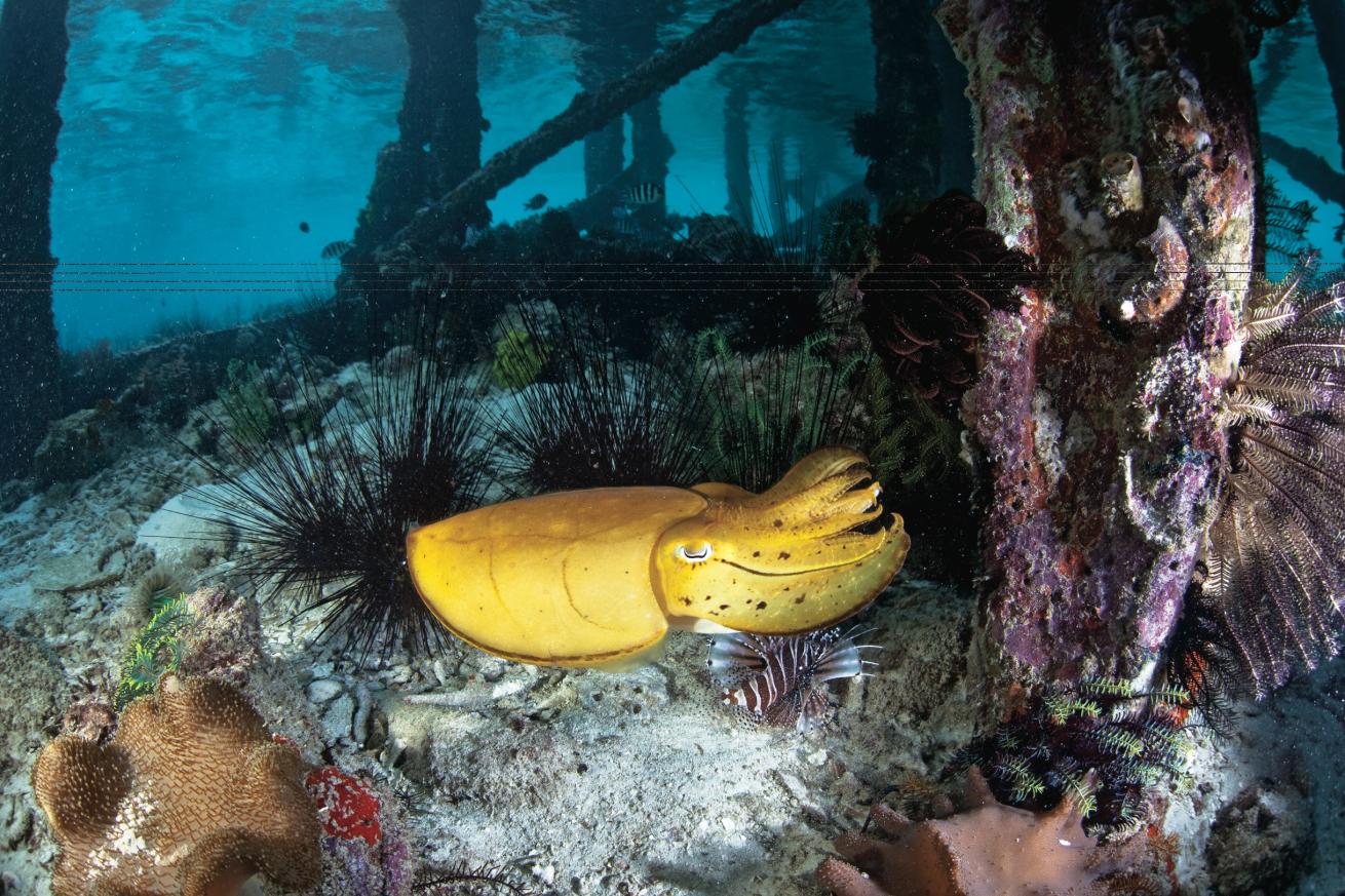 Ignoring divers, well-fed stonefish show their grumpy-looking countenances next to matching mounds of living rock. With incessant currents carrying plankton to the waiting mouths of filter feeders, the stonefish barely have to move in order to feed on large numbers of unsuspecting cardinalfish, damsels or gobies. Not far away, a pair of banded pipefish poke their slender snouts out from crevices, a juvenile crocodilefish mimics a drowned tree branch and a juvenile cuttlefish camouflages itself amid crinoids and sponges. Tear your gaze away from the life on the critter-laden bottom and look upward, where you’ll see a massive school of scad form a silver river of fish slipping between the pier pilings. Onlookers from above, longfin spadefish hover over the scad, watching the parade.