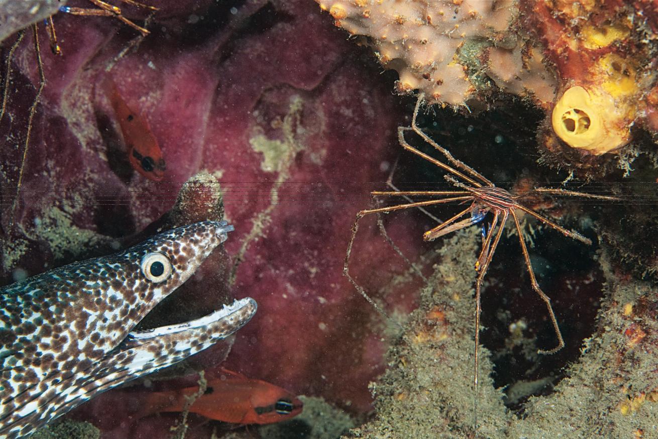 Michele WestmorelandDominica's Cabrits Pier is home to a number of odd critters, like this spotted moray eel and arrow crab.