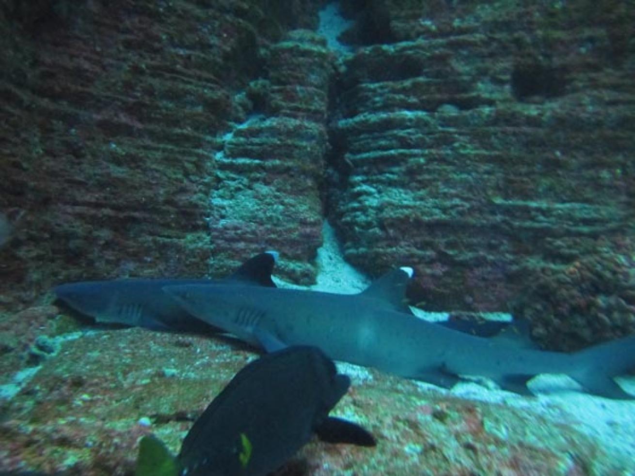 The shark action was better than it has been on previous days. At least, we had more variety. The viz has been so poor that it’s made spotting anything difficult, but on dives two and three I saw a silky, more hammerheads, a silvertip, and the most curious white tips I’ve ever dived with. Normally they’re extremely skittish, but on the last dive they swam to within a couple feet of me, circling around again and again.