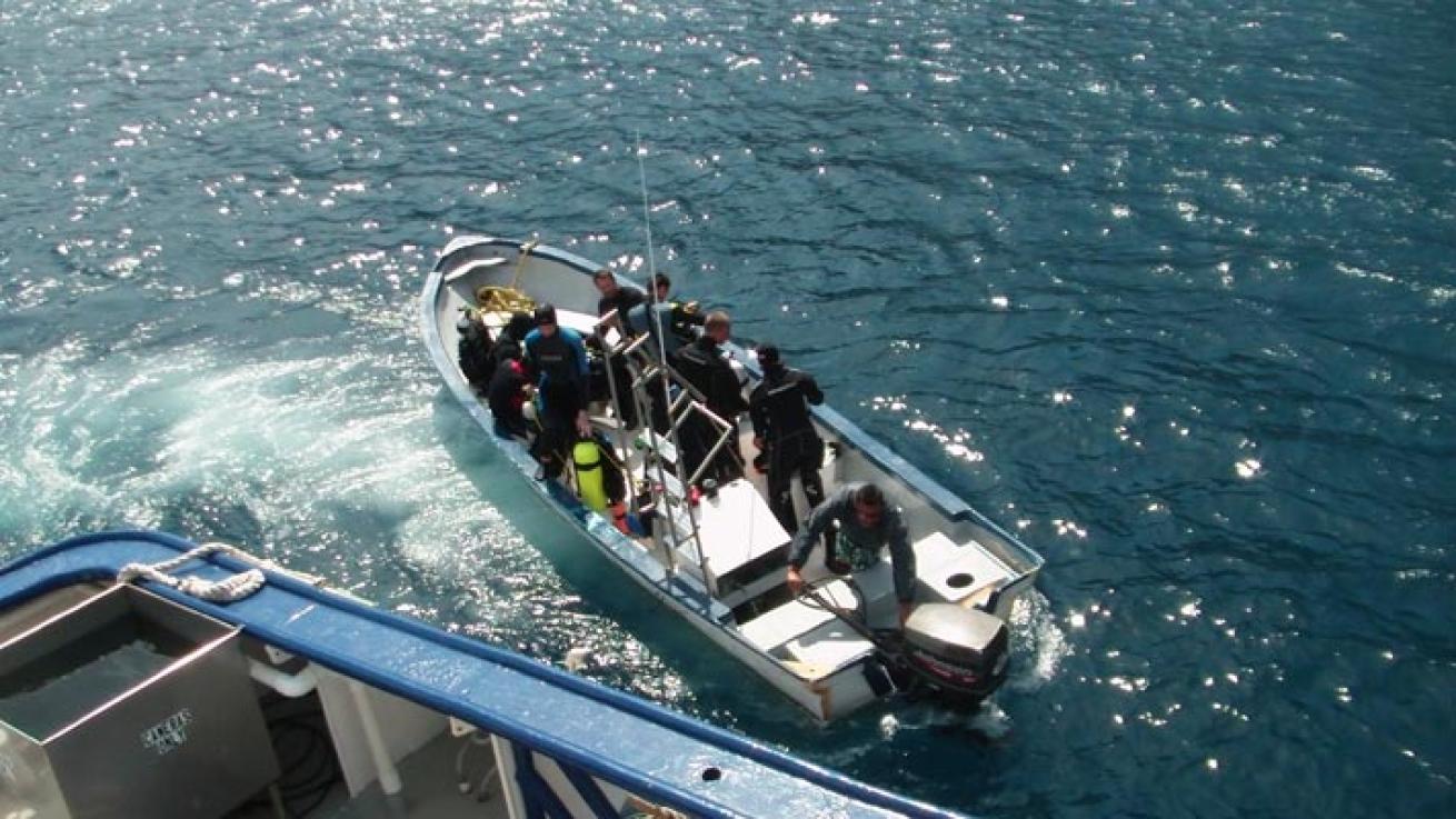 We spent all day tucked away in this small bay, diving Cabo Pierce. The winds have kicked up a bit, but the sheer 150-foot rock walls of the island protect us.
