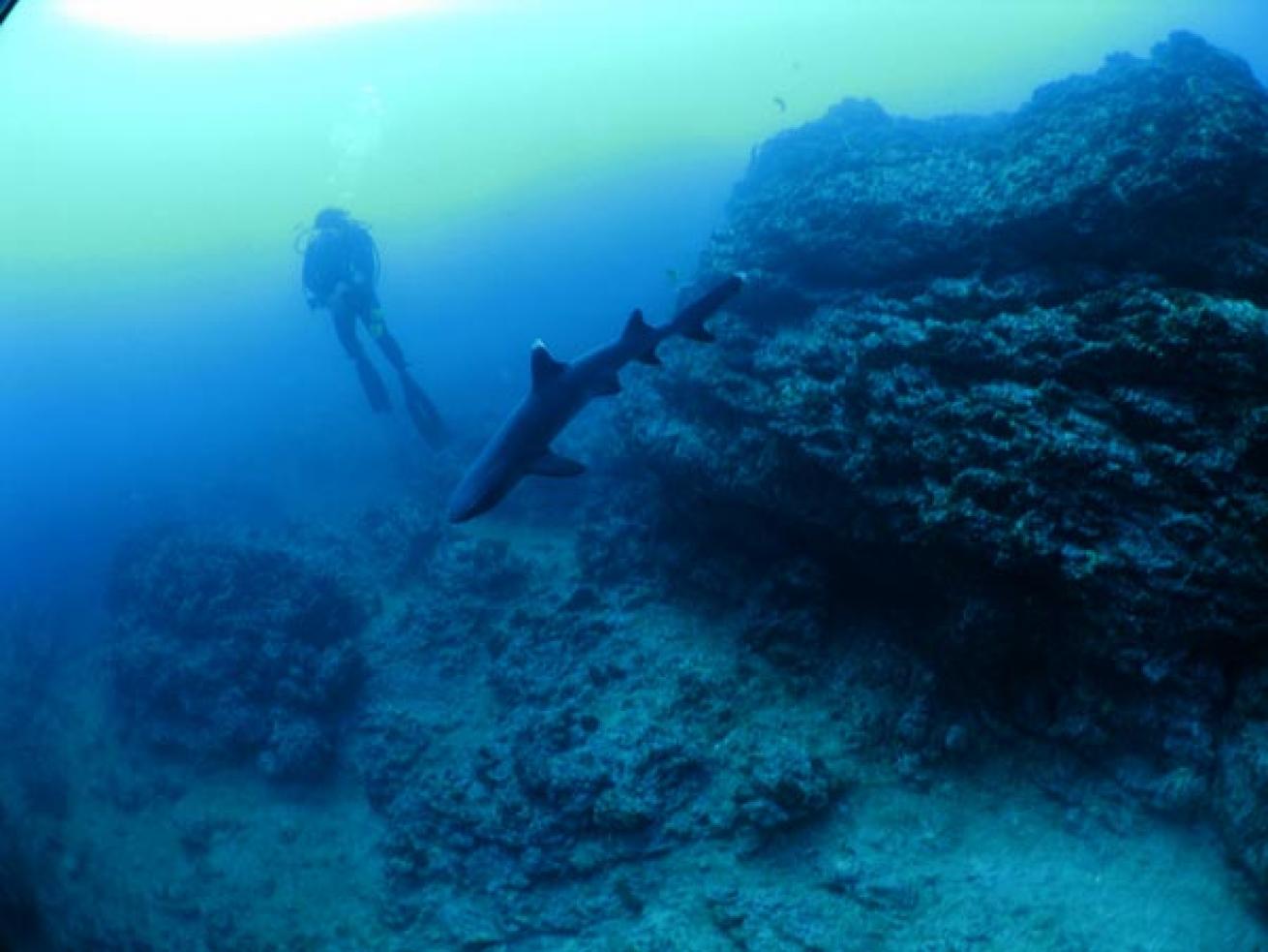 We dived from the pangas all day. Visibility was greatly diminished, and got worse with each dive. My first dive was the best. We dropped in on the outside of the point, and drifted in toward the lava flow. I saw a little rock outcropping at 110 feet and popped down there for a look. While there, I was buzzed by a massive hammerhead, followed soon thereafter by a manta that came in for a look. Other than a brief glimpse of that same manta on the second dive, it was the last anyone would see of our marine friends today.